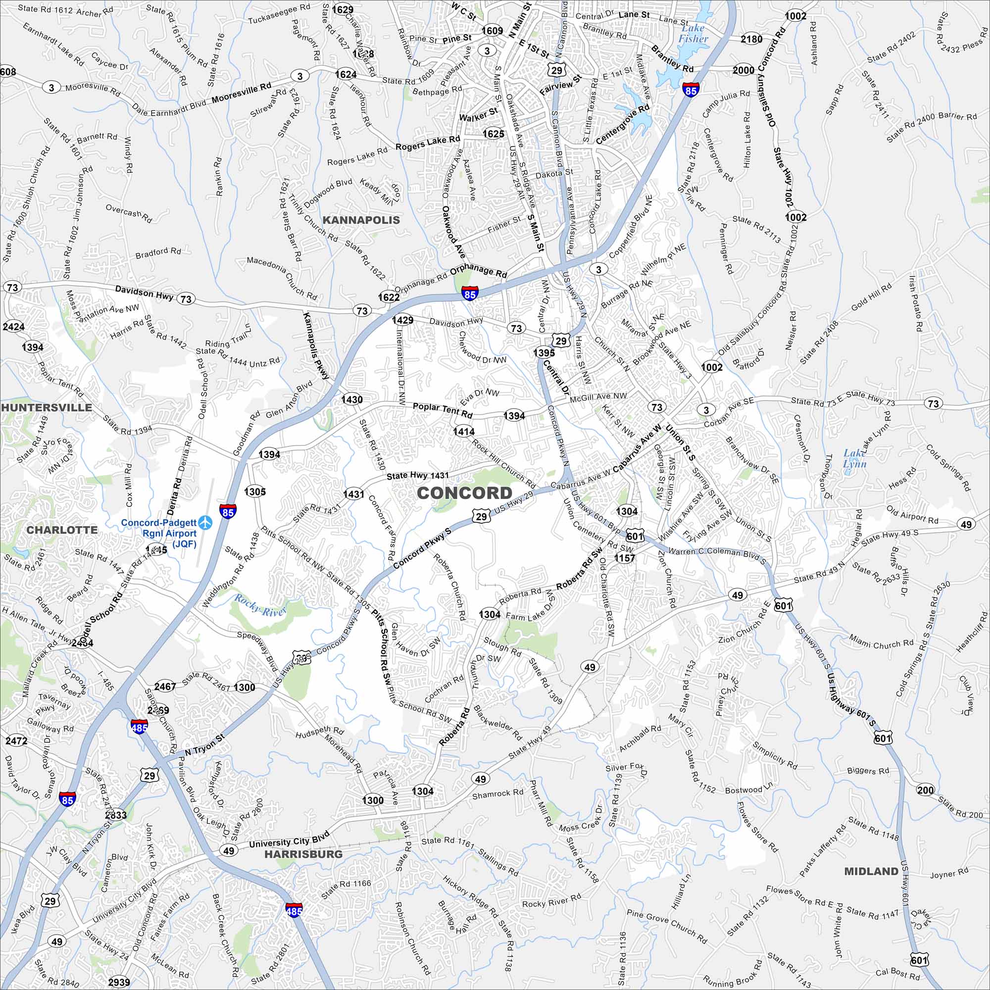 Our map of Concord shows streets, highways, and nearby green space. Located northeast of Charlotte, the city is home to Charlotte Motor Speedway. It lies in the rolling Piedmont region.