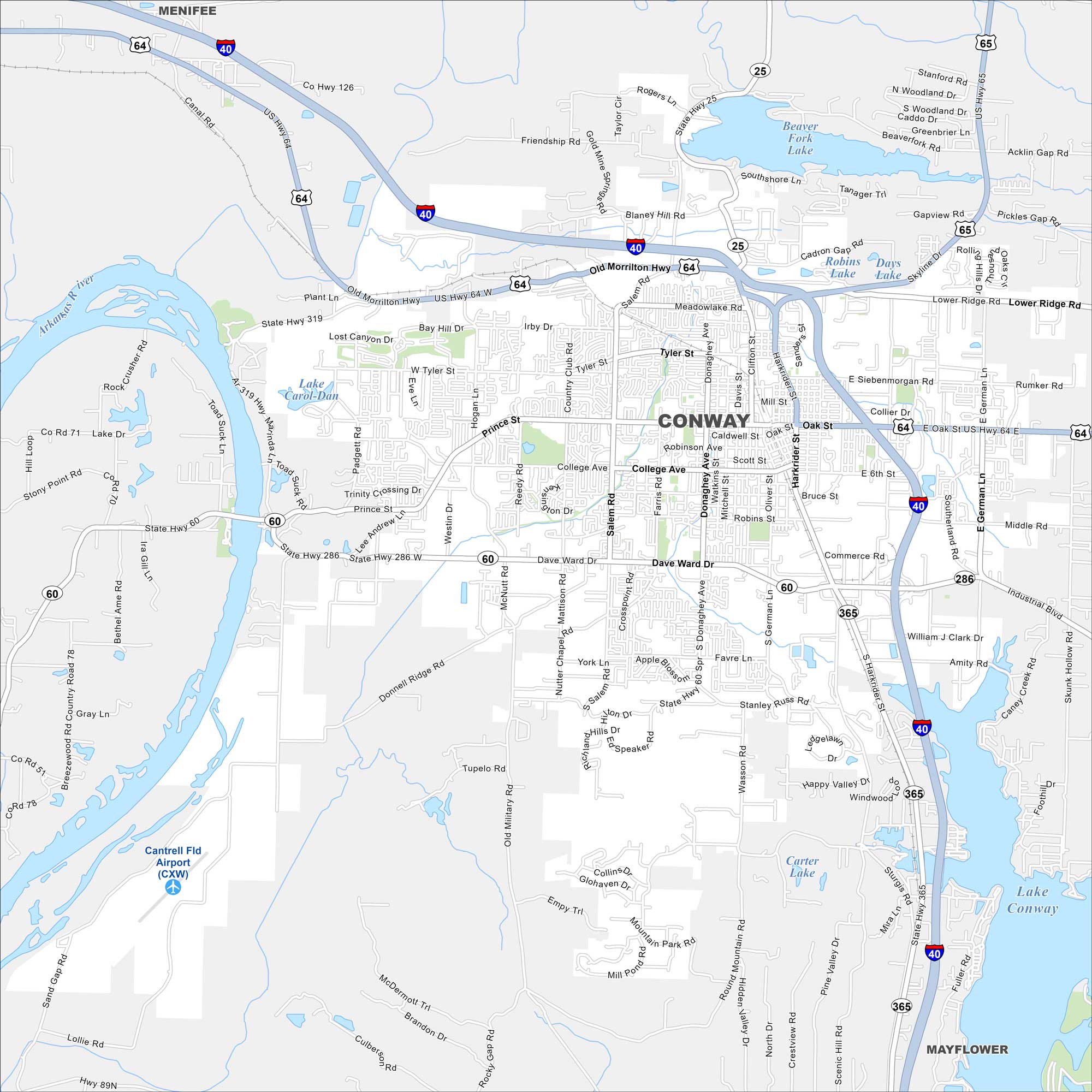 Our map of Conway highlights US-64 and its downtown streets. Just north of Little Rock, it’s called the “City of Colleges”. The Arkansas River runs close by on the west side.