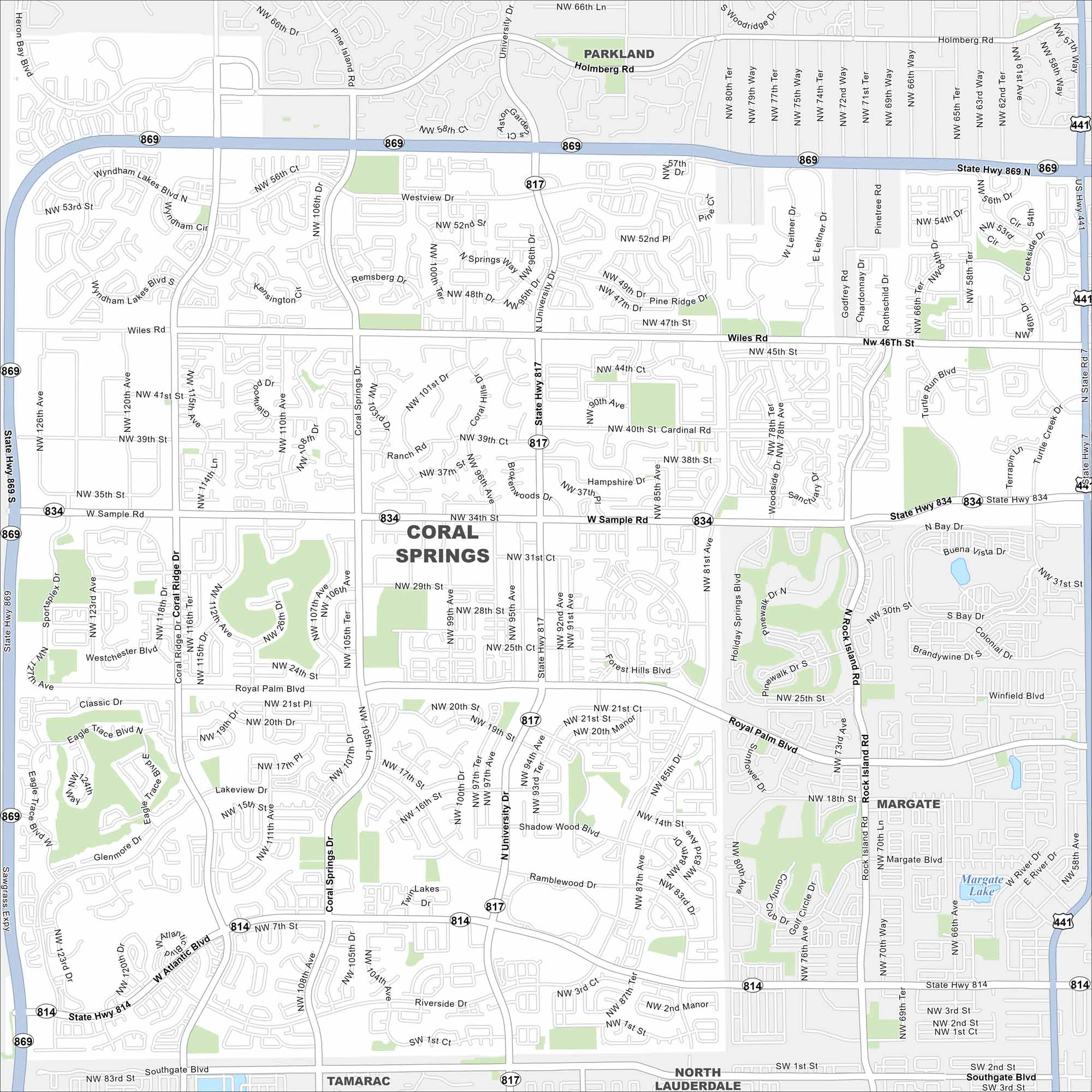 Our map of Coral Springs shows its roads, highways, and canals. Planned with wide boulevards and parks, the city is part of Broward County. The Everglades stretch out just to the west.