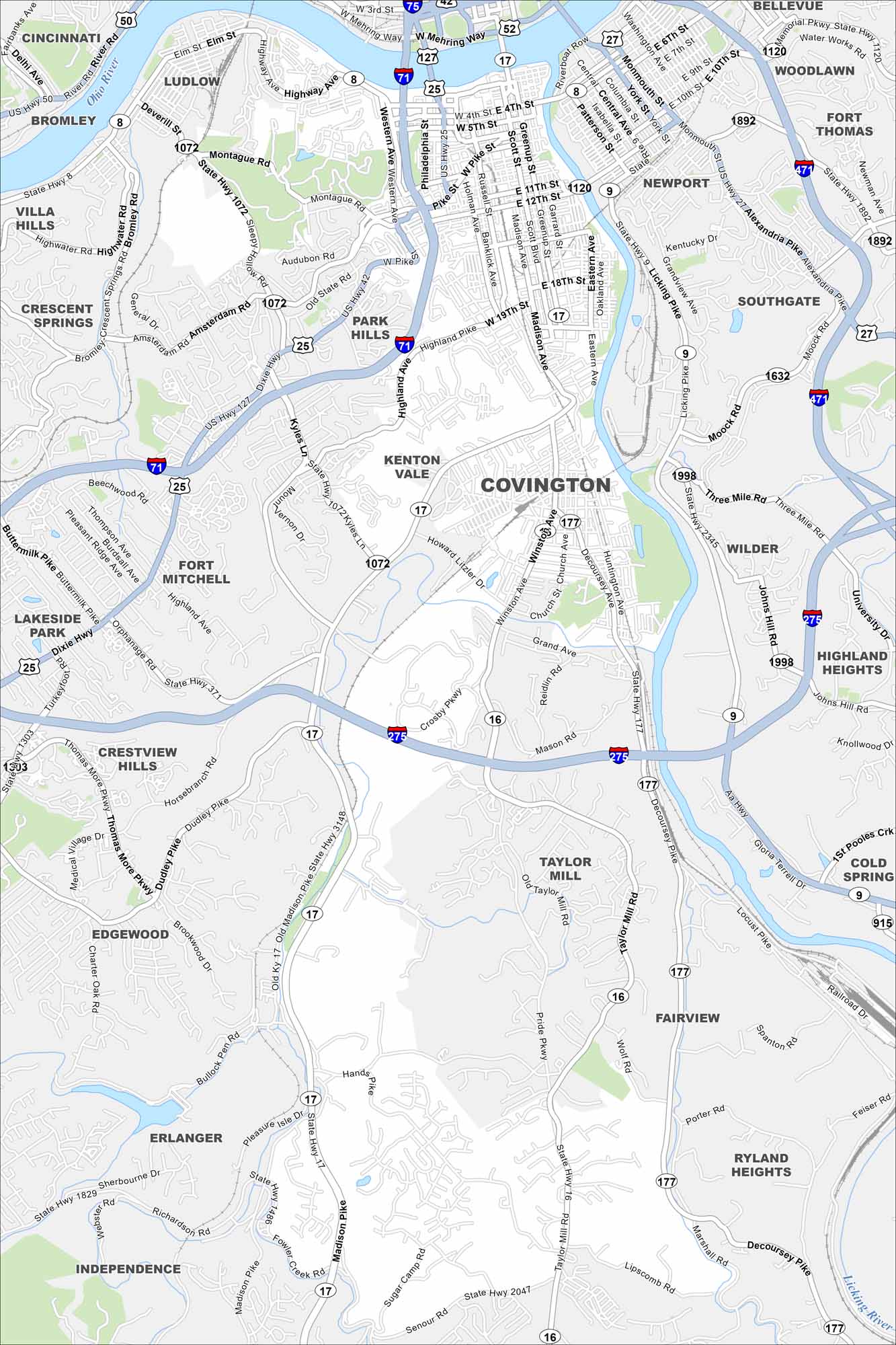 Our map of Covington shows its streets, highways, and riverfront. The city sits directly across from Cincinnati, where the Ohio and Licking Rivers meet.