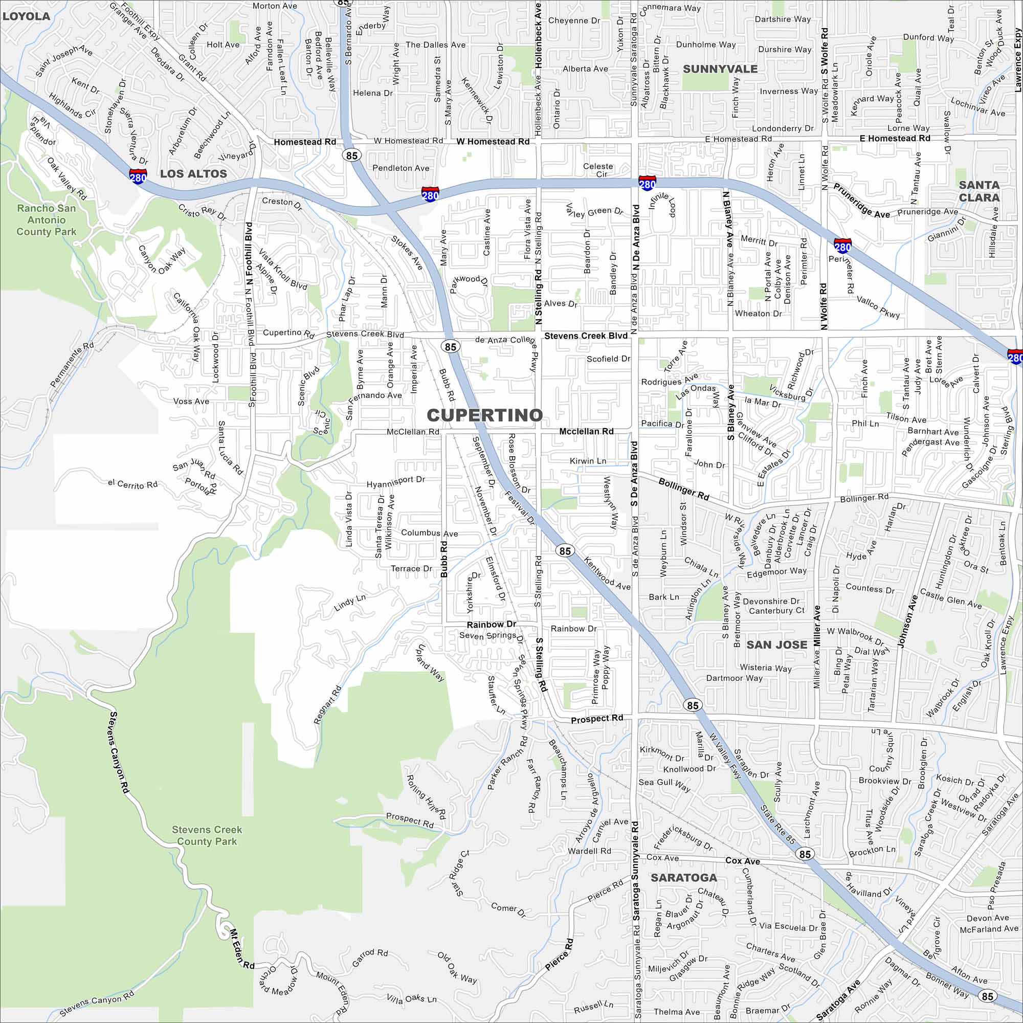 Our map of Cupertino shows its roadways, freeways, and nearby foothills. In the heart of Silicon Valley, the city is home to Apple’s headquarters. The Santa Cruz Mountains frame its western edge.