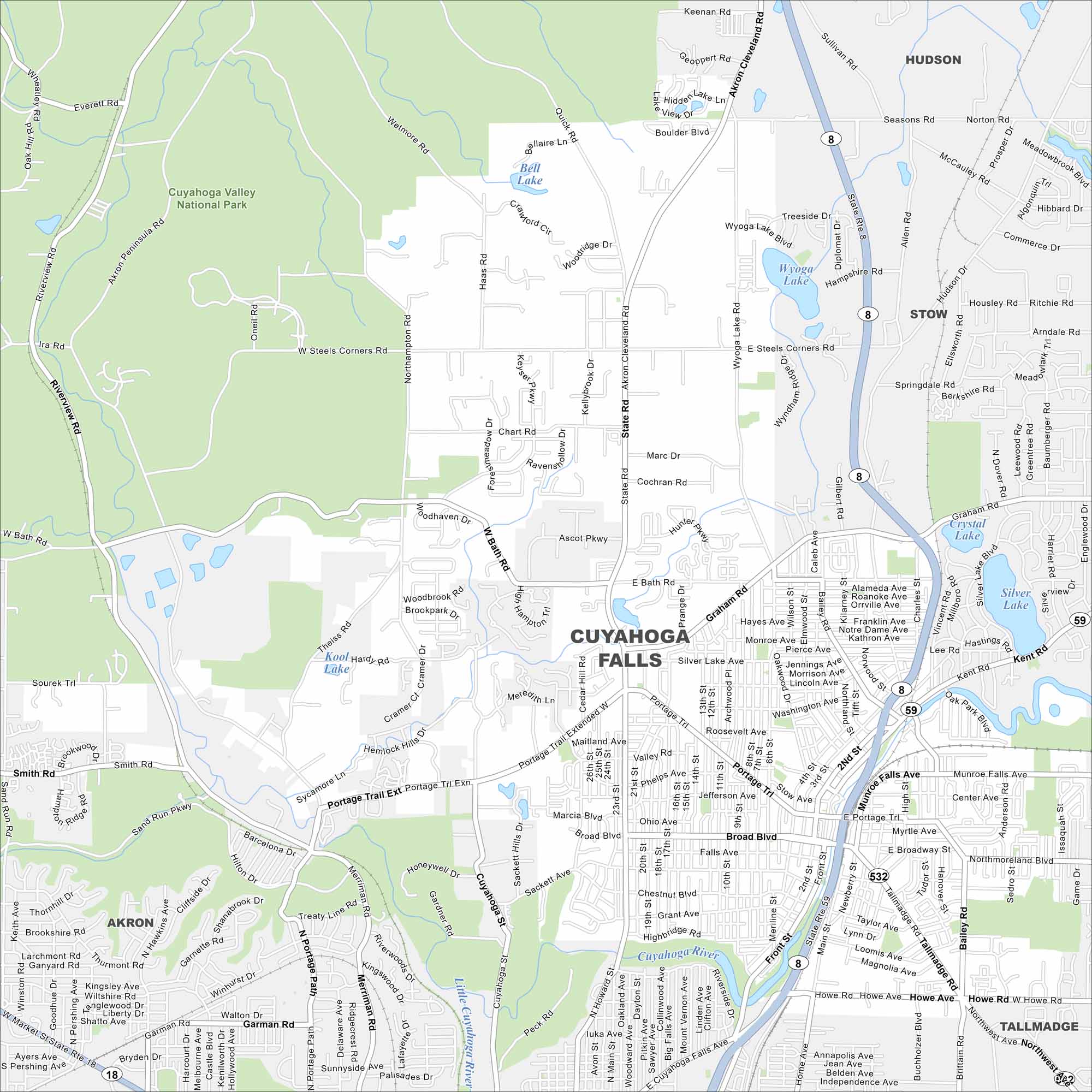 See the mapped streets, highways, and river crossings in Cuyahoga Falls. This city grew around the Cuyahoga River, where rapids once powered industry. Today, the riverfront remains its centerpiece.