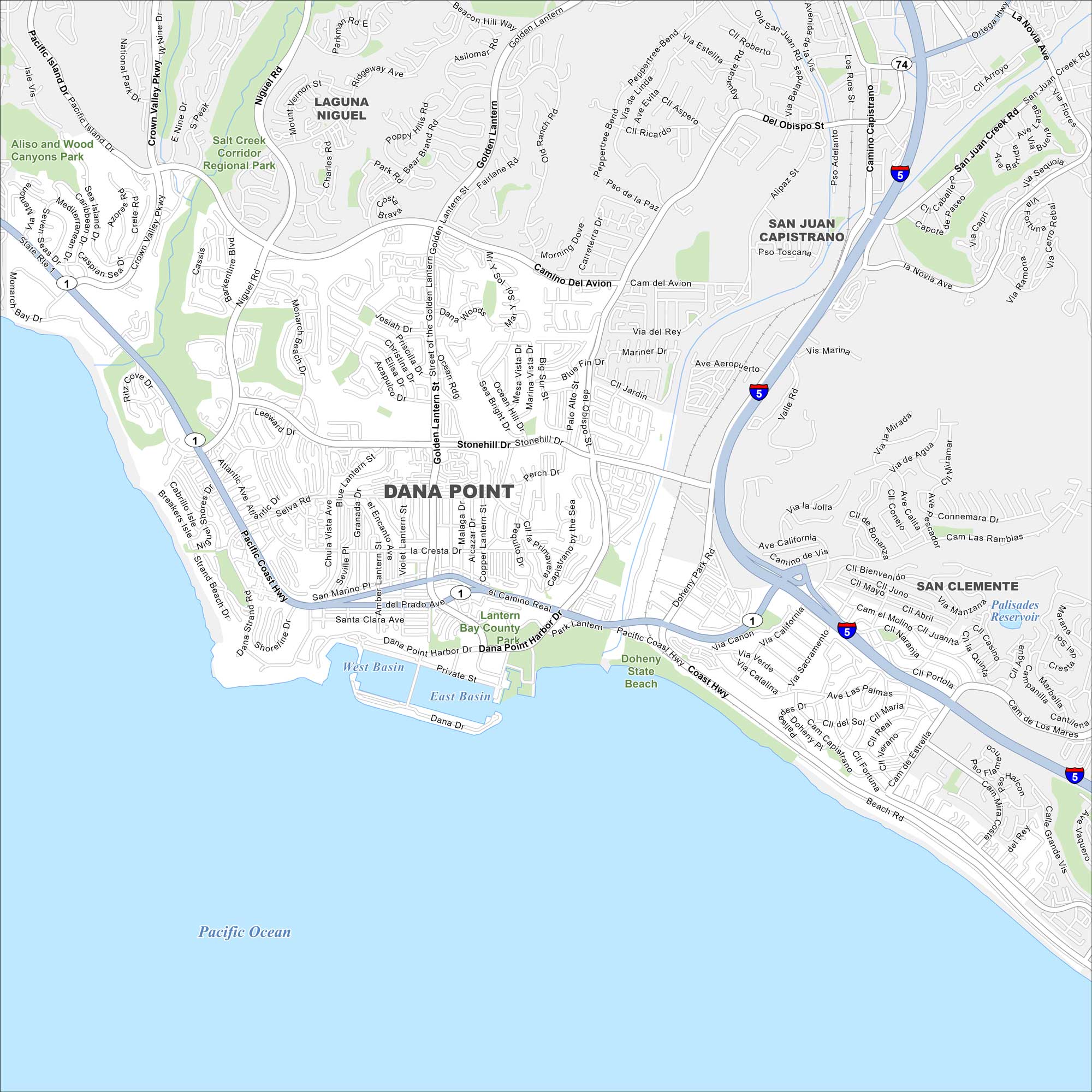 Our map of Dana Point shows its streets, highways, and shoreline. The city is perched on the Pacific Ocean between Los Angeles and San Diego. Its marina and beaches make it a popular stop.