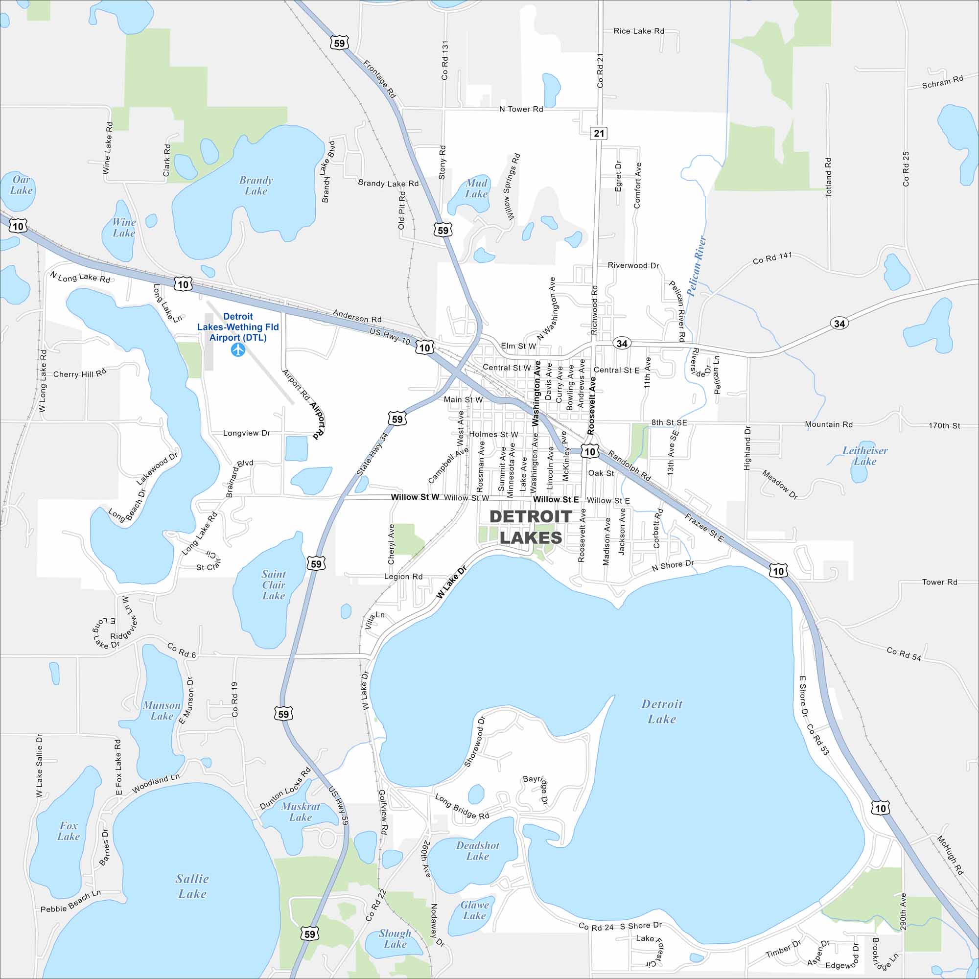 Our map of Detroit Lakes brings out a cluster of lakes scattered around the town. Roads extend between the shorelines and wooded areas. The city is a summer destination for boating and fishing.