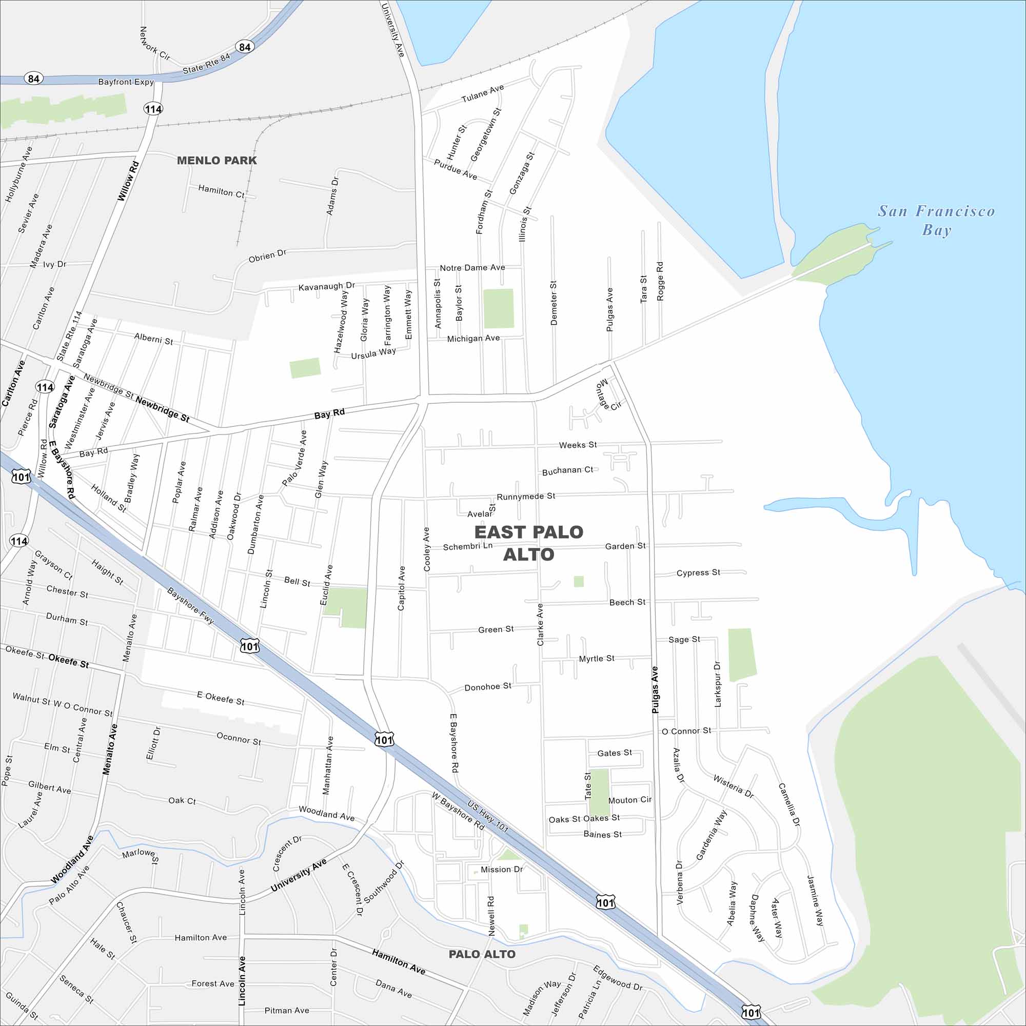 East Palo Alto is on the edge of the San Francisco Bay. This map highlights wetlands and open shoreline areas nearby. Its position places it between Palo Alto and the tech corridors of Silicon Valley.