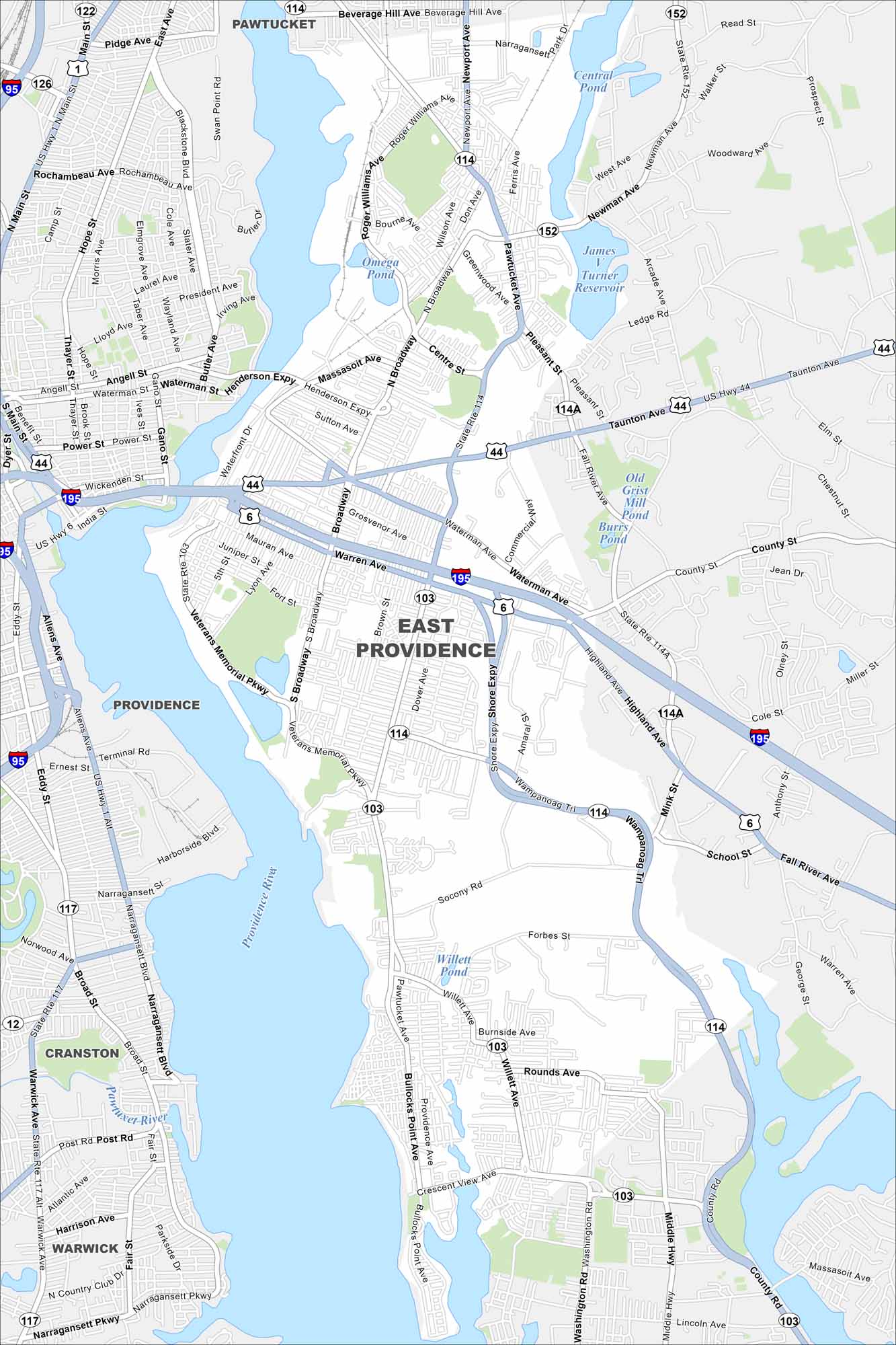 Our map of East Providence shows the Providence River cutting along the west side. Bridges connect it directly to Providence. This city is known for its mix of waterfront neighborhoods and historic districts.
