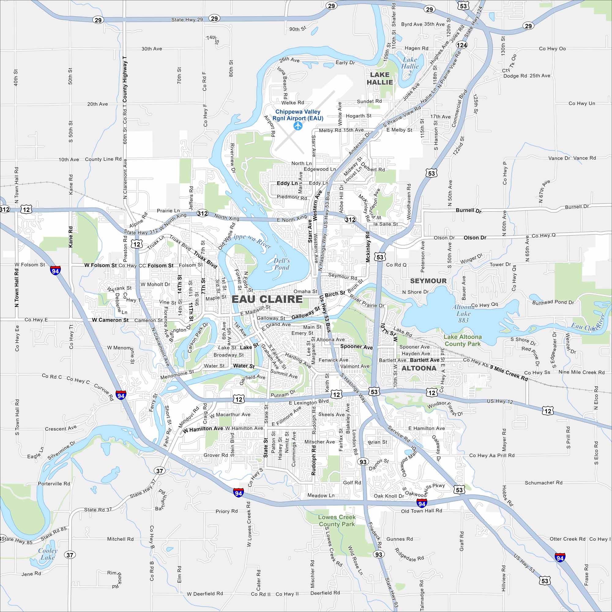 Our map of Eau Claire highlights the Chippewa and Eau Claire Rivers flowing together downtown. Trails and parks follow both waterways. The city is often nicknamed “Clear Water” because of these rivers.