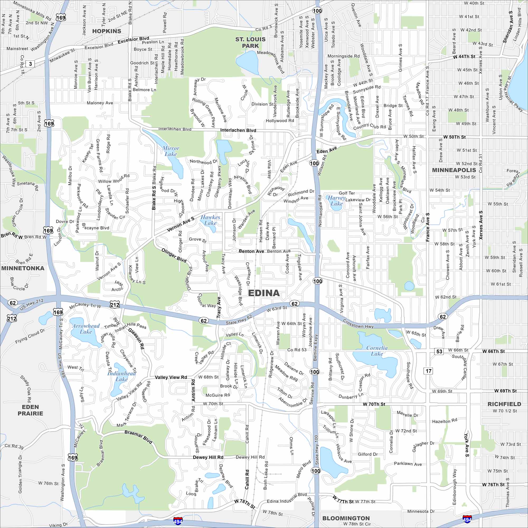 Edina is located southwest of Minneapolis. Our map highlights several lakes, including Arrowhead and Lake Cornelia. The city is well known for its tidy neighborhoods and park system.