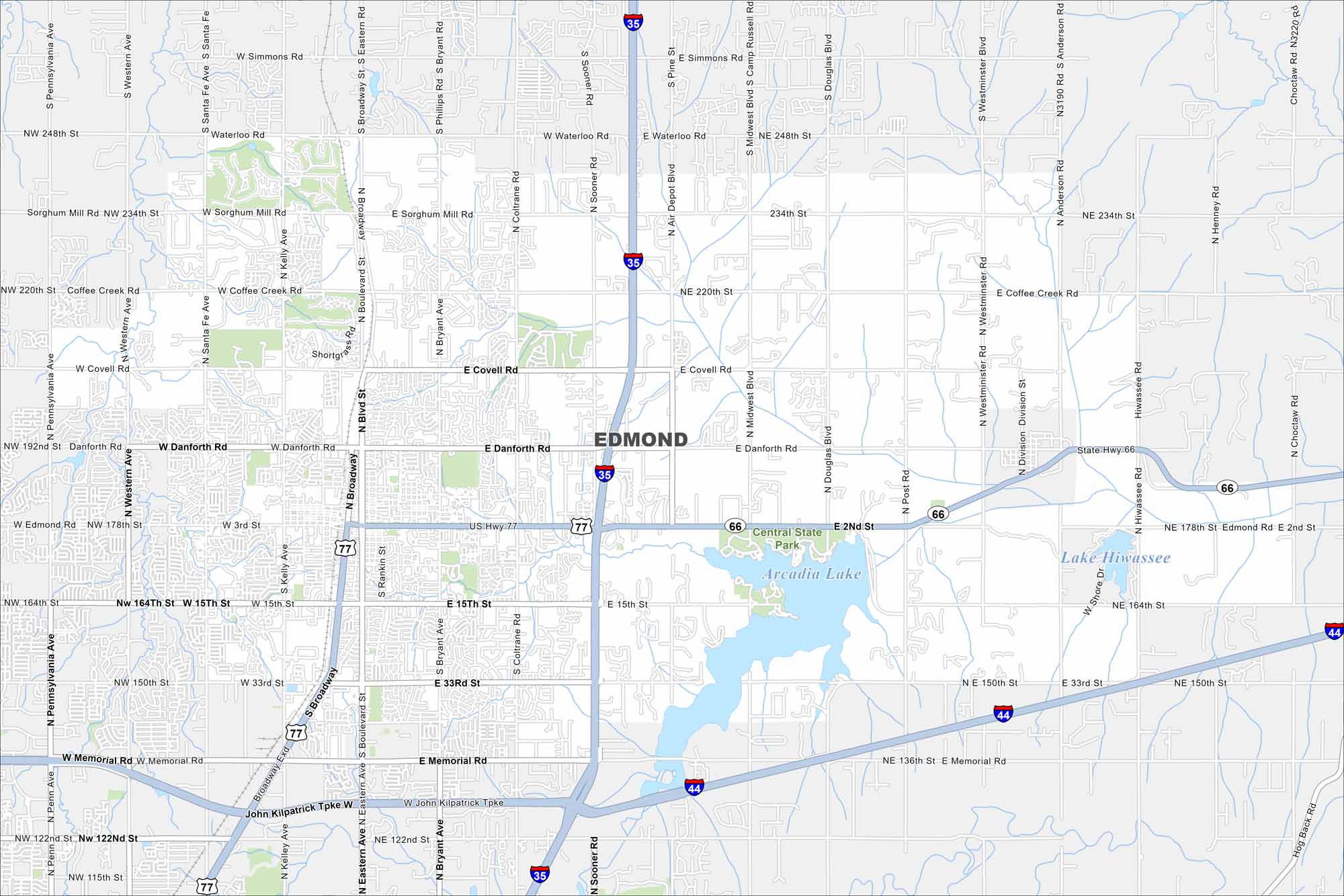 Our map of Edmond marks a large suburban area north of Oklahoma City. Arcadia Lake sits on the east side, great for outdoor activity. Edmond is also crossed by major highways linking it directly to the capital.