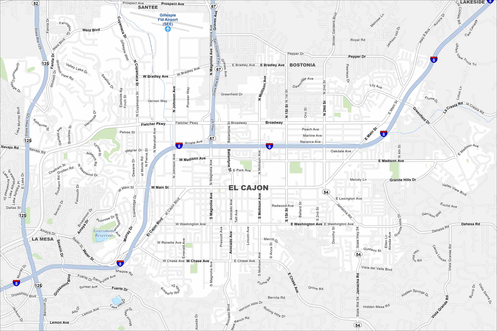 Explore El Cajon in a valley east of San Diego. This map highlights this city surrounded by mountains on nearly all sides. Its name means “the box”, fitting because of its geography.