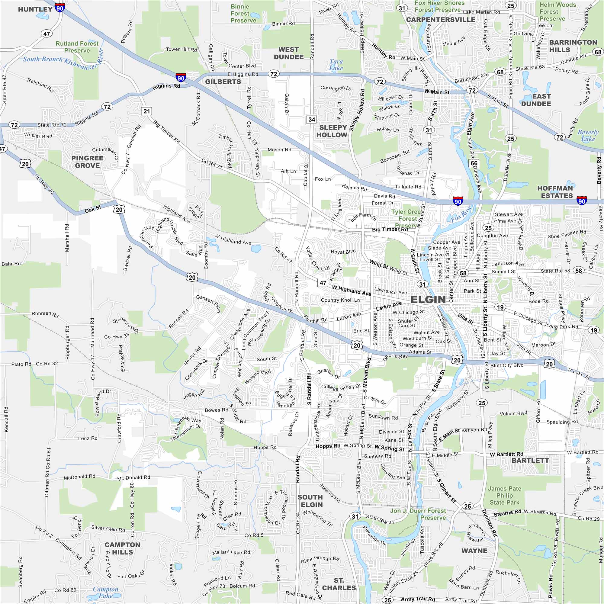 Our map of Elgin highlights the Fox River. Green parks and trails line both riverbanks. It’s known as “The City in the Suburbs” because it blends urban living with nearby nature.
