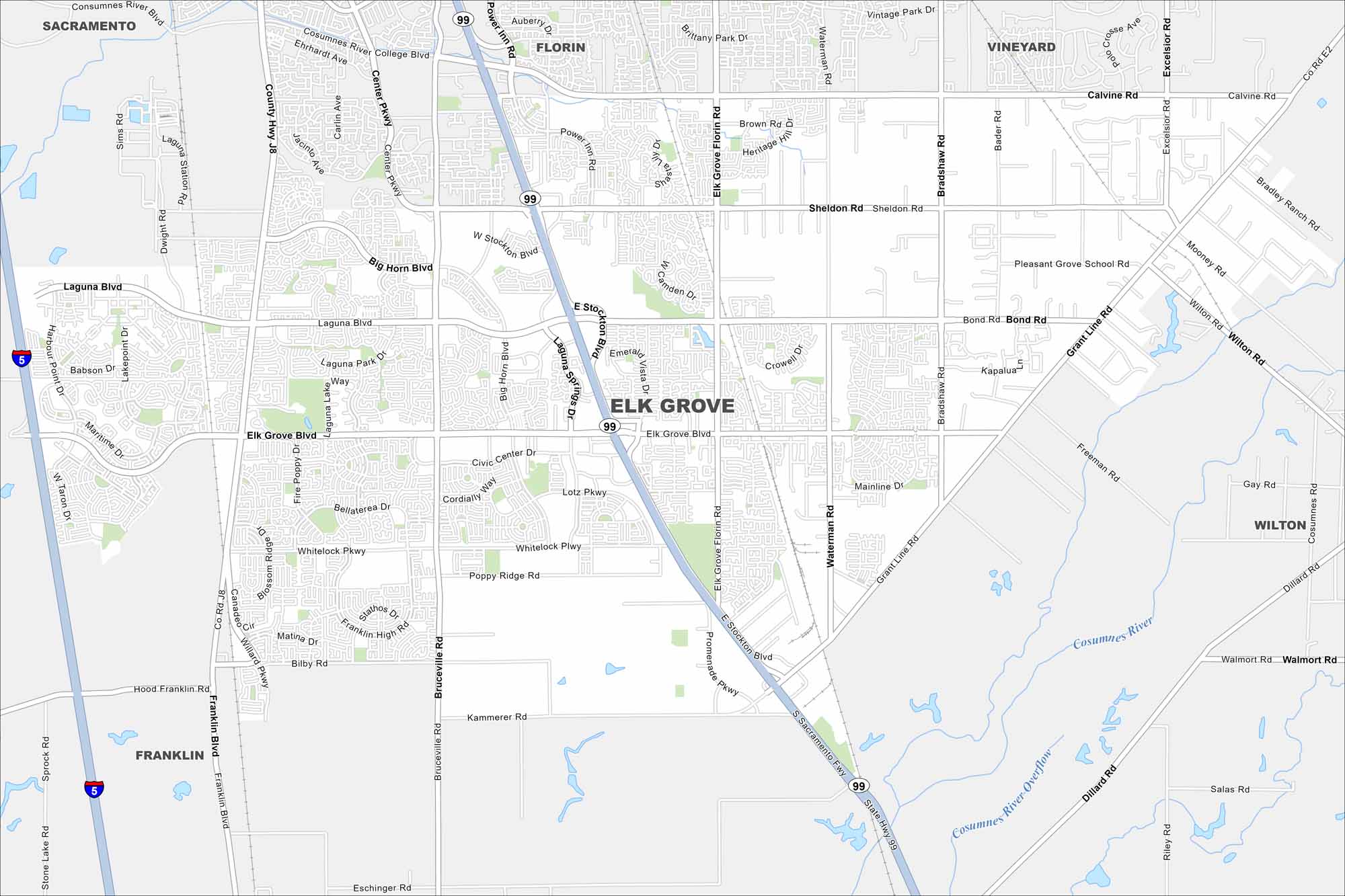 Elk Grove lies just south of Sacramento, with Laguna Creek and other waterways cutting through. It’s now one of California’s fastest-growing cities, thanks to its location near the capital.