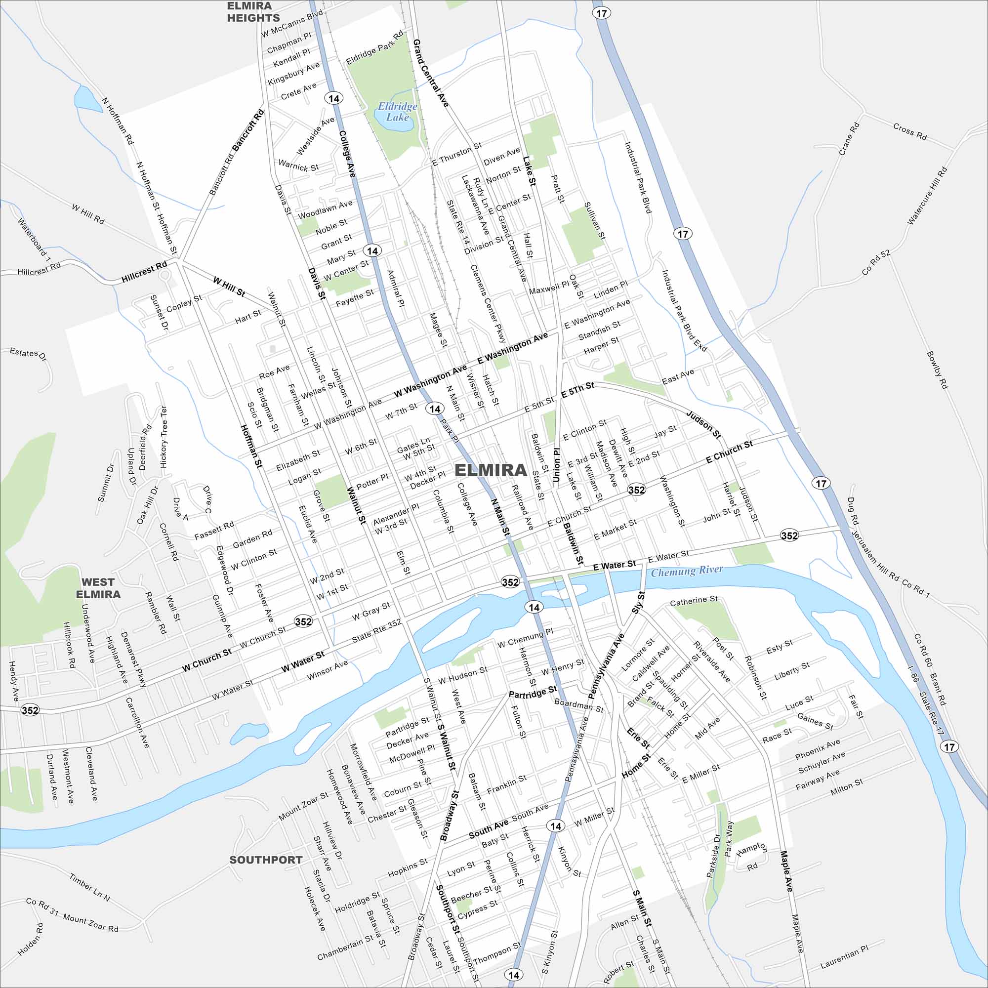 Elmira is located along the Chemung River in southern New York. The city connects to Route 14 and 17. It’s often known as the “Queen City” of the Southern Tier.