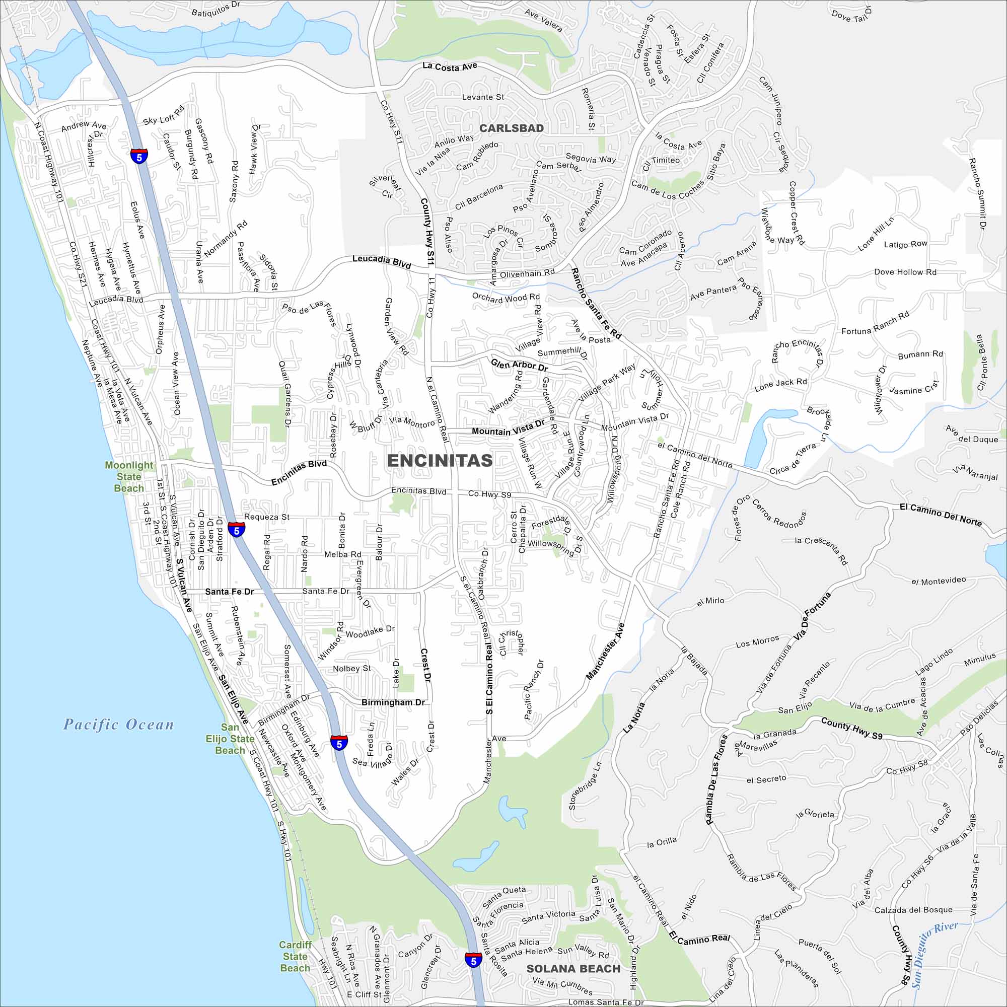 Our map of Encinitas puts it on the Pacific shoreline north of San Diego. While beaches line the coastline, parks and waterways fill the rest.