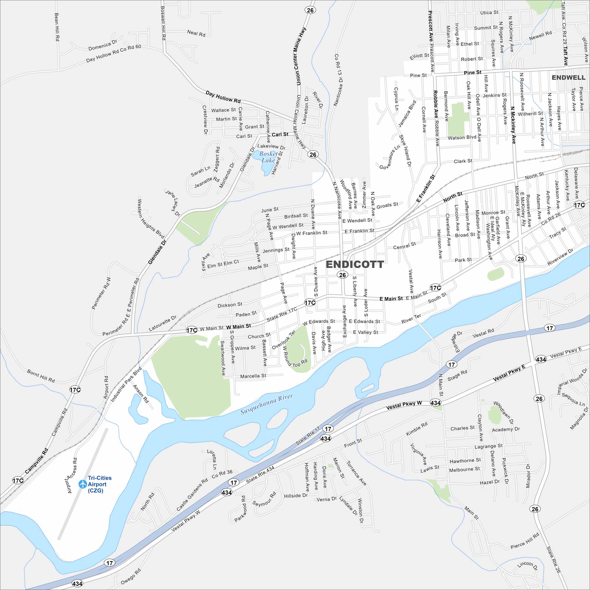 Endicott lies west of Binghamton along the Susquehanna River. Streets spread out on both sides of the water. The river valley gives it a distinct shape.