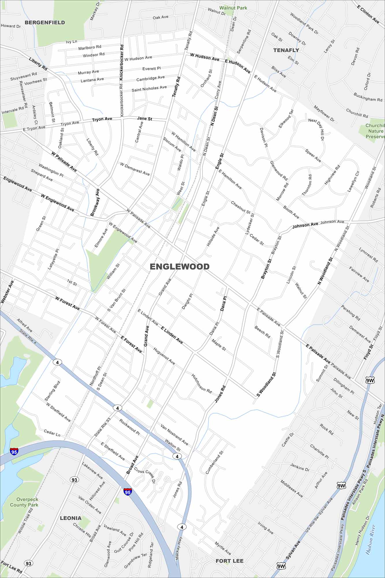 Our map of Englewood shows it just west of the Hudson River. It’s nestled against the Palisades cliffs with steep terrain at the eastern edge.