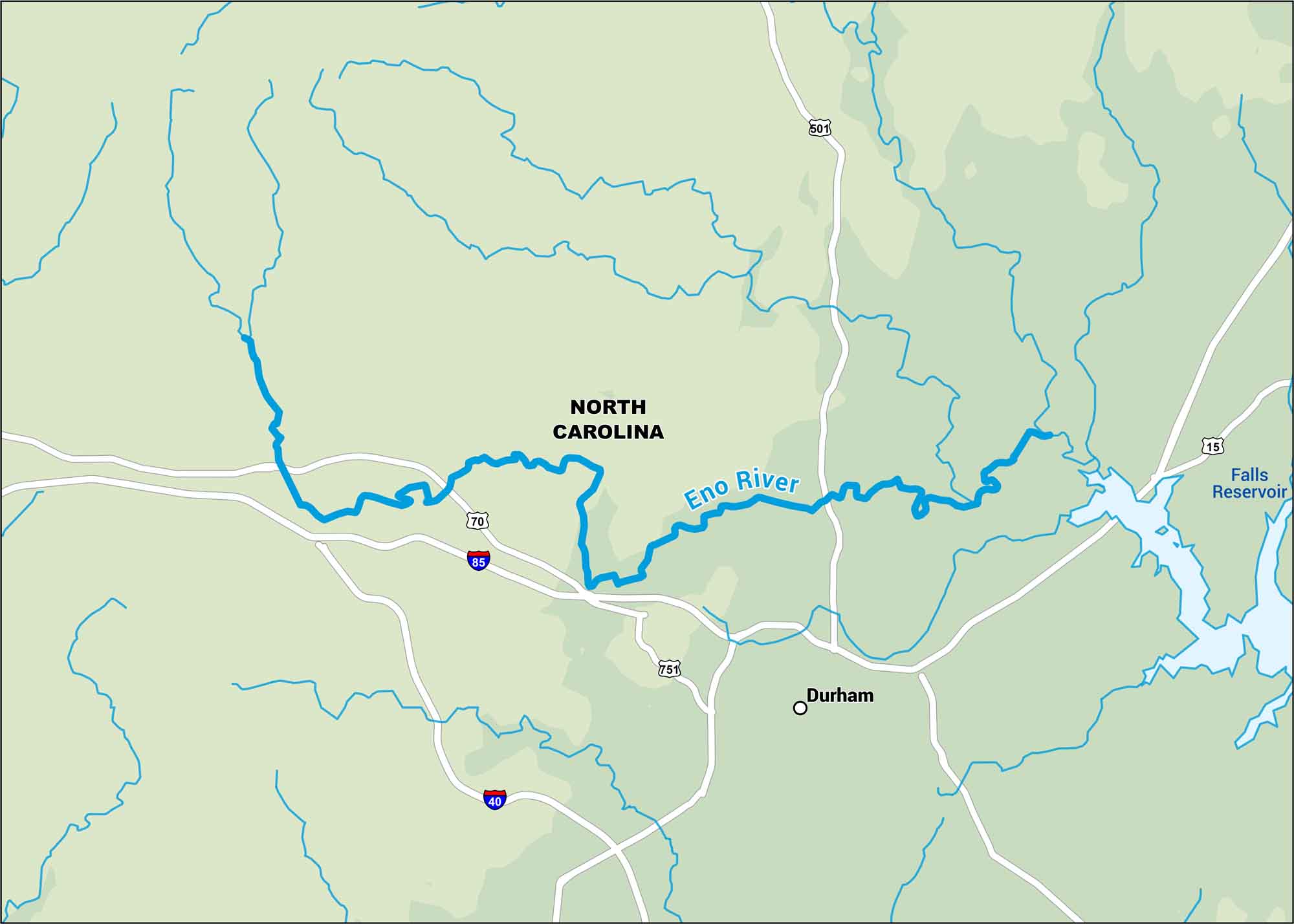 Flowing through North Carolina’s Piedmont, the Eno winds near Durham and rolling green hills. This map displays this small river with an outsized sense of peace.