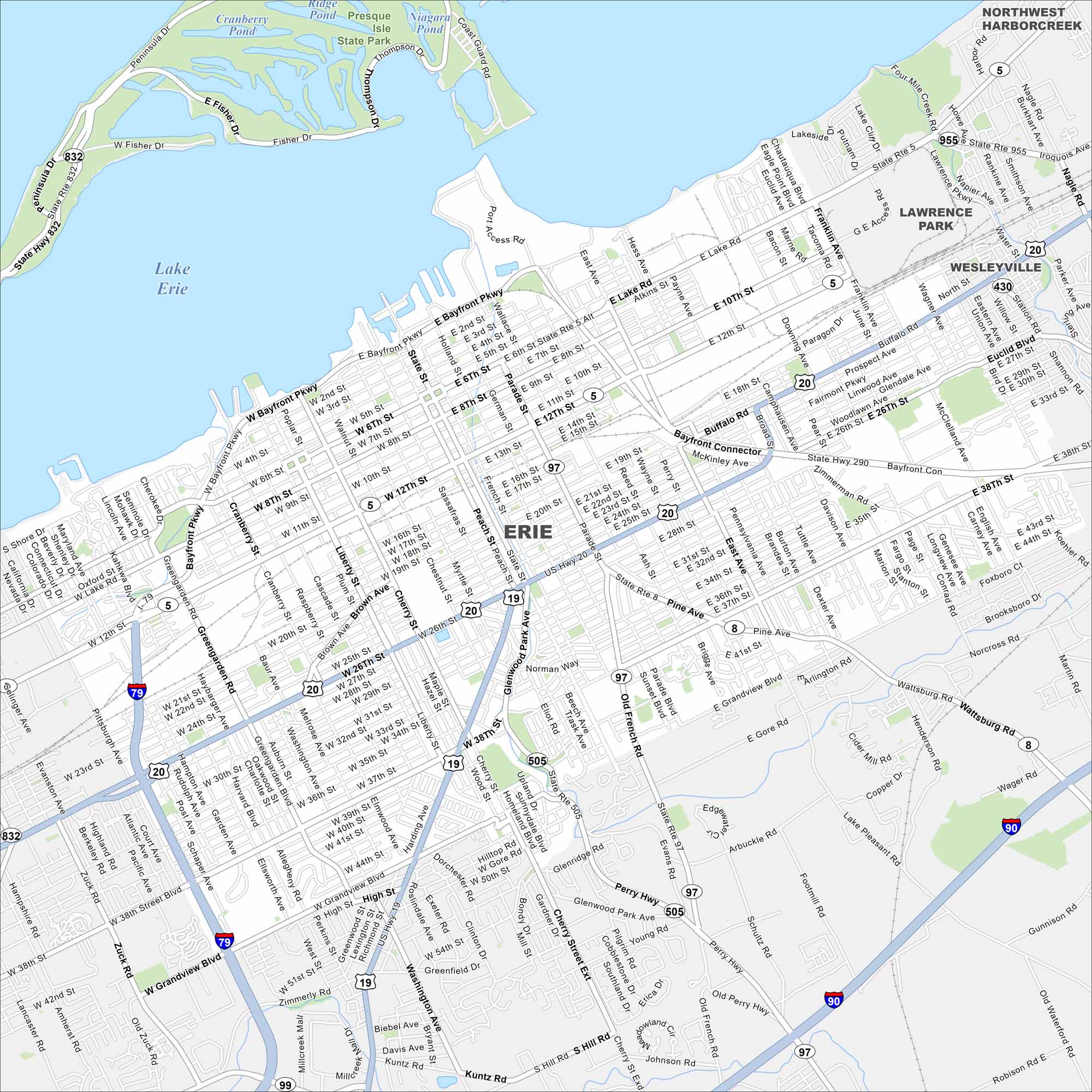 Erie lies on the southern shore of Lake Erie. Its downtown runs right up to Presque Isle Bay. The peninsula sheltering the bay is the city’s landmark.