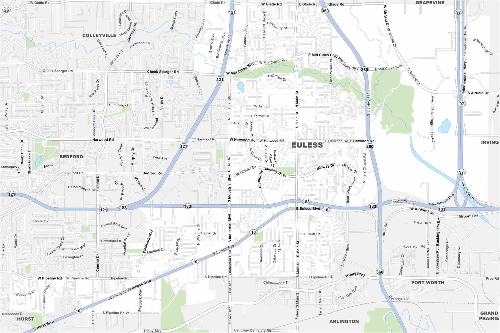 Euless lies in the heart of the Dallas-Fort Worth metroplex. Highways 183 and 121 meet in its center. Our map shows highways, waterways and parks.