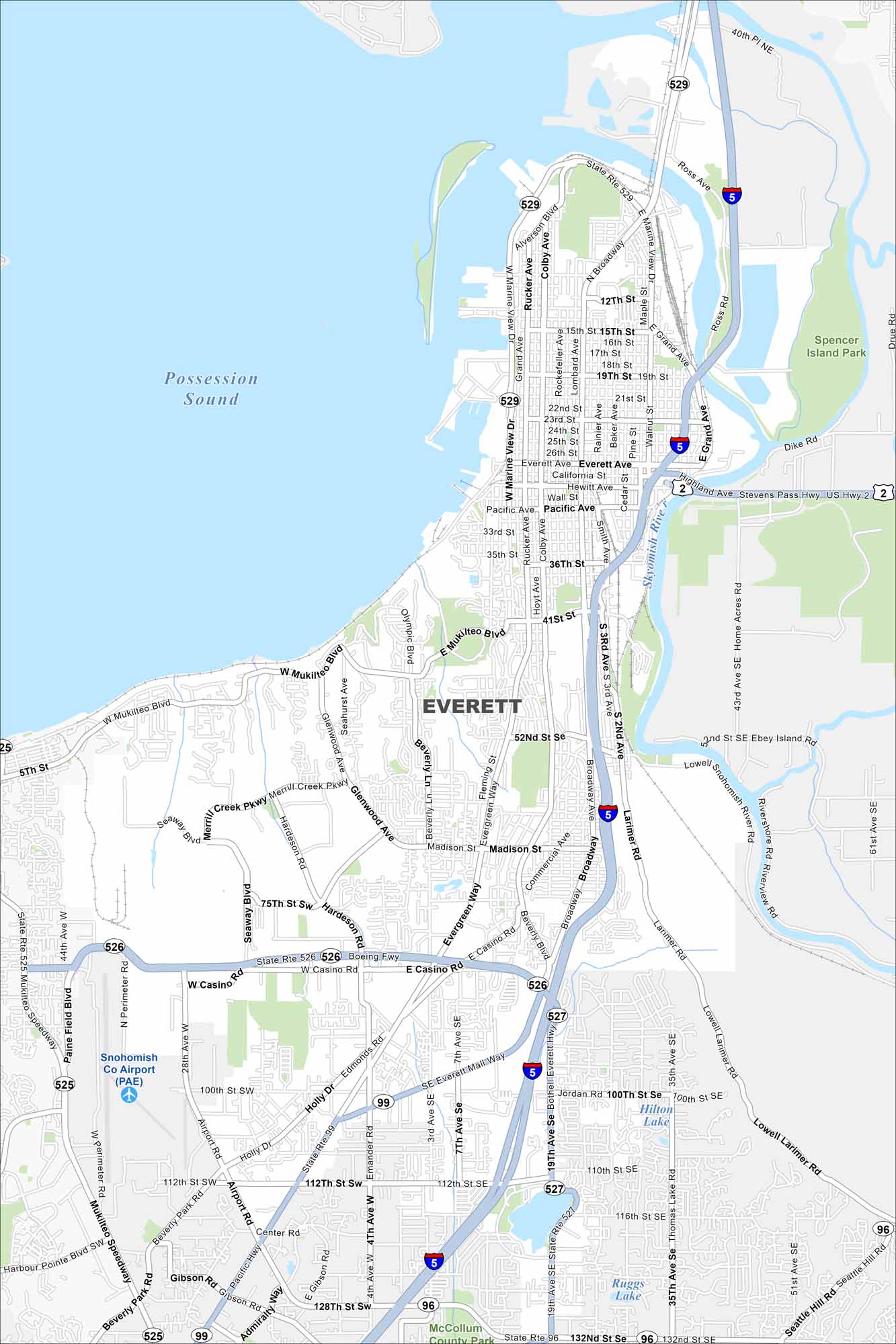 Explore our map of Everett on Puget Sound. The Snohomish River delta spreads out to the east. Its mix of water and coastline.