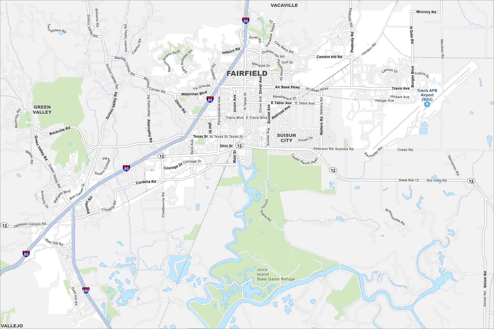 Fairfield lies between San Francisco and Sacramento in Solano County. This map shows highways, green spaces, and Travis Air Force Base. Its spot along I-80 makes it a major crossroads.