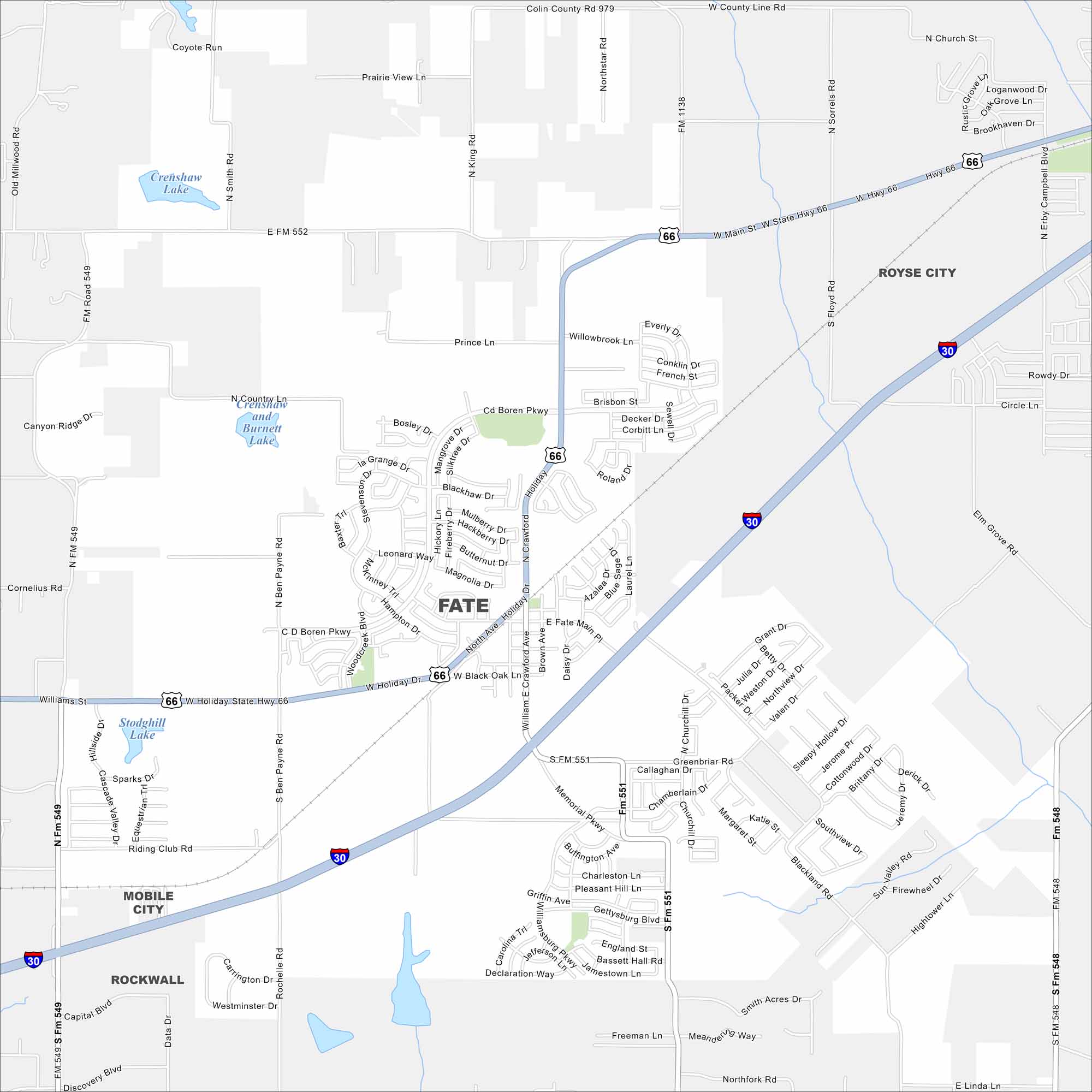 Explore our map of Fate just east of Rockwall. It’s located between I-30 and open stretches of farmland. It has a small-town feel, which makes it unique.