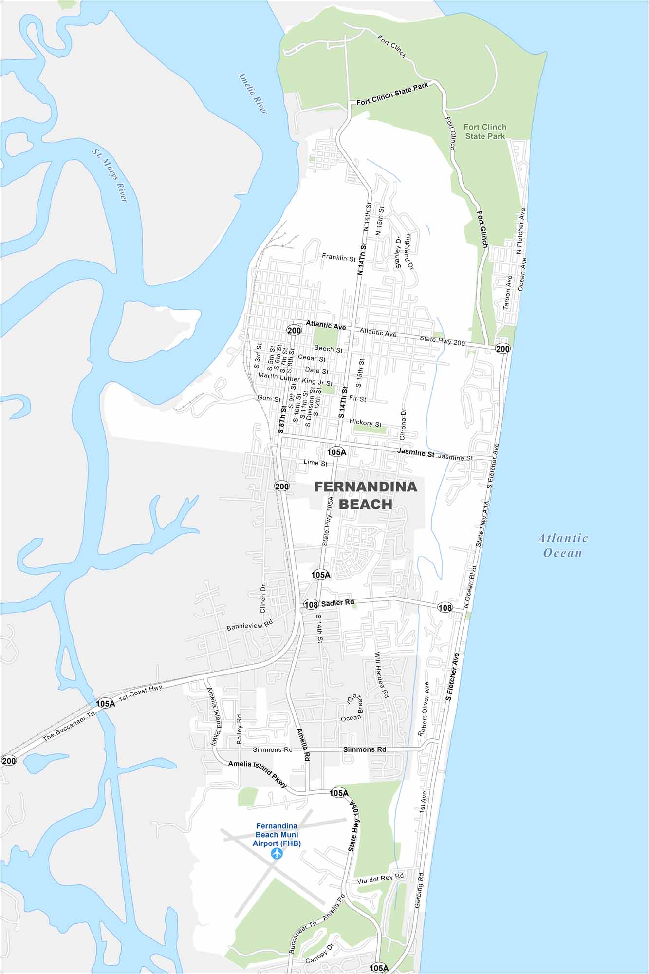 Check out our map of Fernandina Beach on Amelia Island. It hugs the Atlantic shoreline with wide beaches to the east. The barrier island location makes it unique spot in Florida.