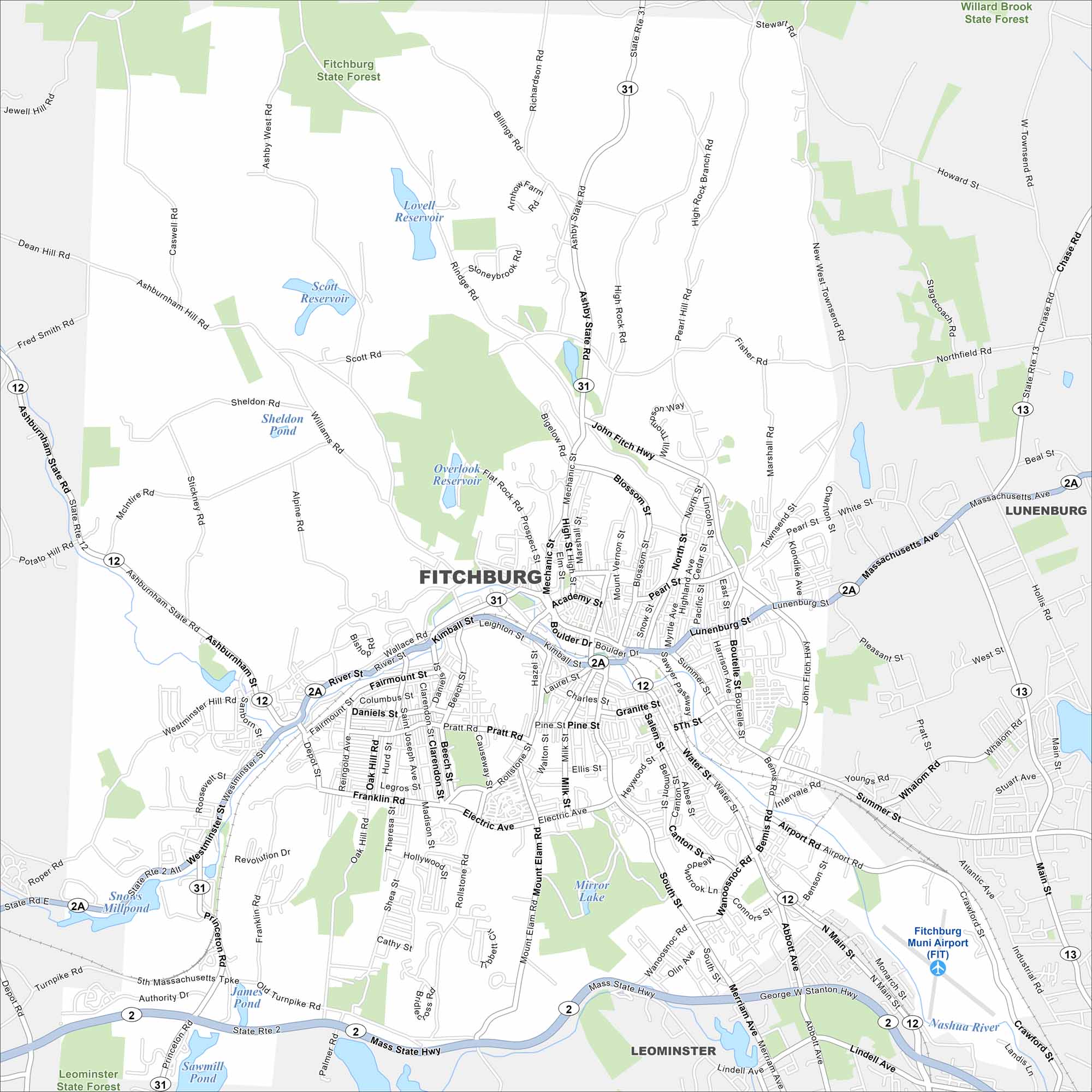 Fitchburg lies in north-central Massachusetts among rolling hills. The Nashua River runs right through the city. On our map, its ponds and small lakes stands out against the hilly backdrop.