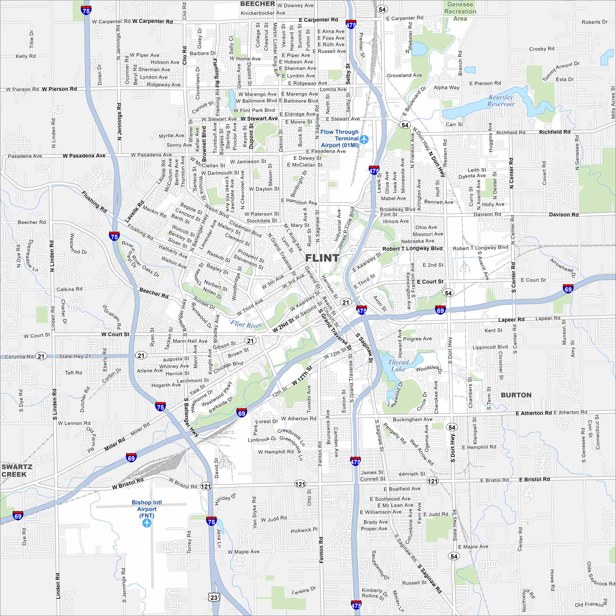 Flint sits along the Flint River in eastern Michigan. Its streets stretch out from the downtown core into wide neighborhoods. On our map, the river curves are the feature that catches your eye first.