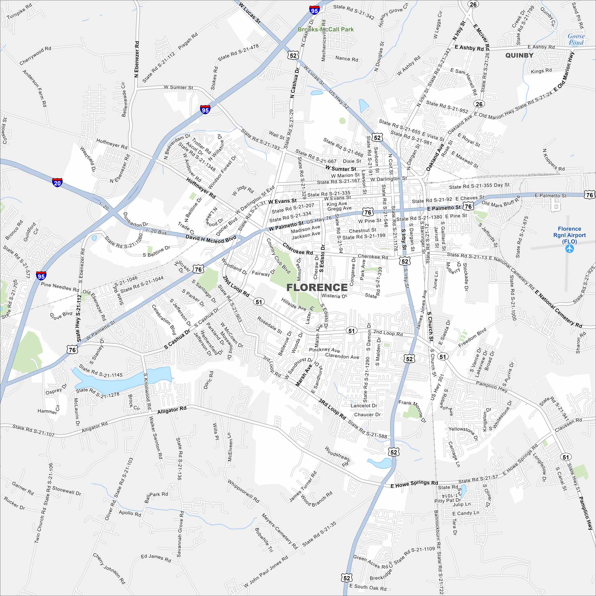 Florence is in the Pee Dee region of the state. Rail lines and highways cross here, giving it a hub-like feel. Our map includes major routes, water and more.
