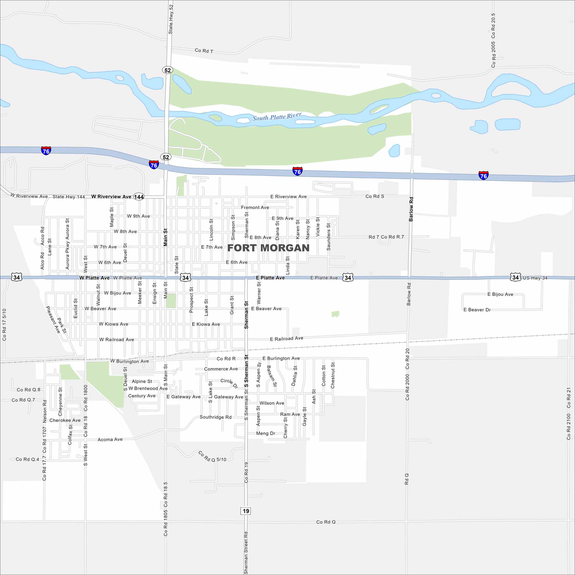 Our map of Fort Morgan highlights its spot along the South Platte River. Wide farmland surrounds the city in every direction. I-76 runs just north, which is parallel to US Highway 34.