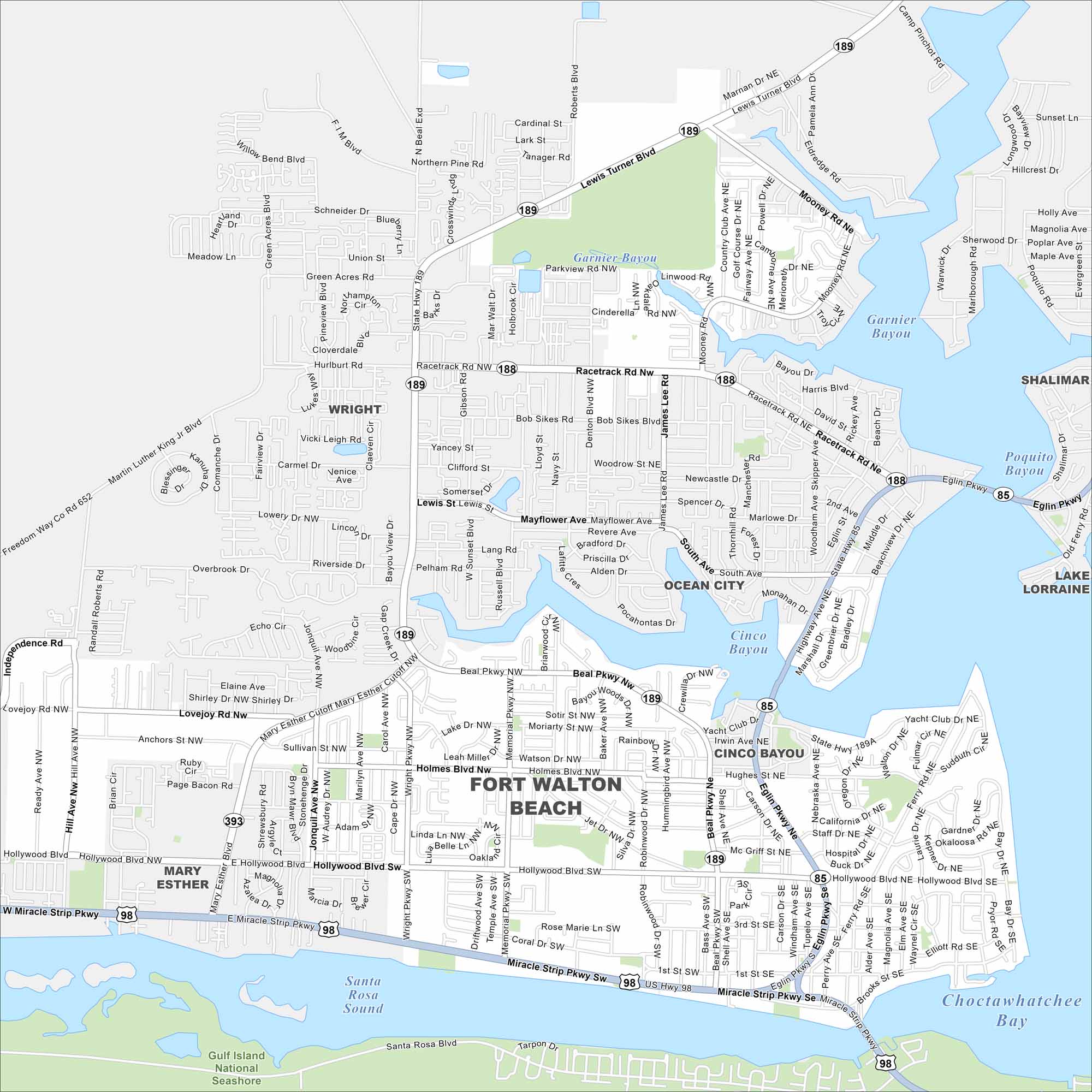Our map of Fort Walton Beach shows it between Choctawhatchee Bay and the Gulf Coast. White-sand beaches line the southern edge. U.S. 98 runs straight through the heart of town.