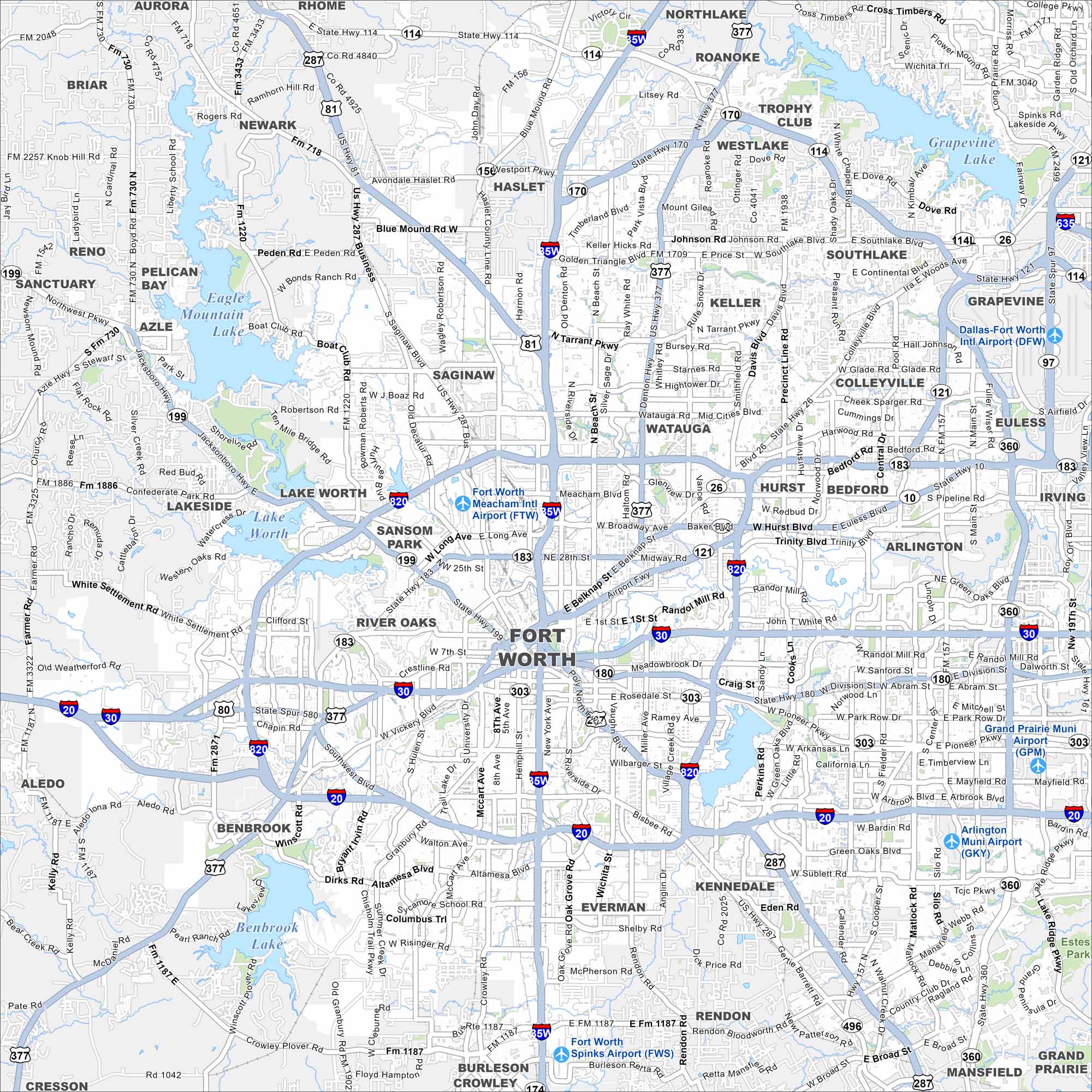 Explore our map of Fort Worth to see I-35W, I-30, and I-20 linking the city across North Texas. The Trinity River winds around downtown with neighborhoods spreading outward. Fort Worth is often called “Where the West Begins” because of its deep cowboy heritage.