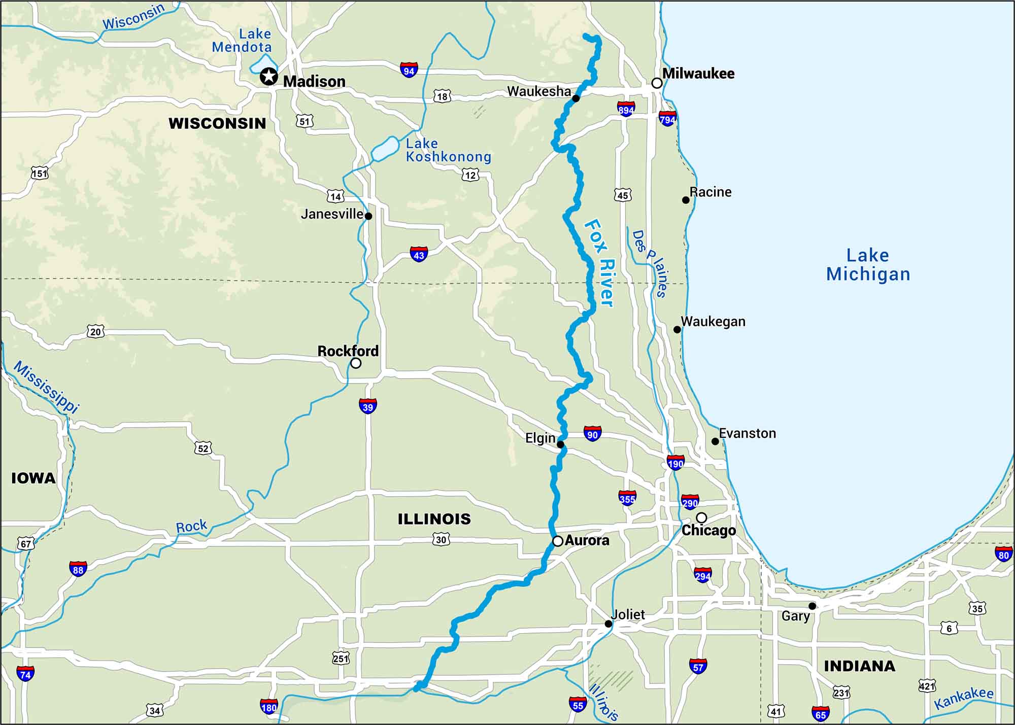 The Fox River runs through Wisconsin and Illinois, tying together towns like Elgin and Aurora. This map shows its slow bends close to Lake Michigan.