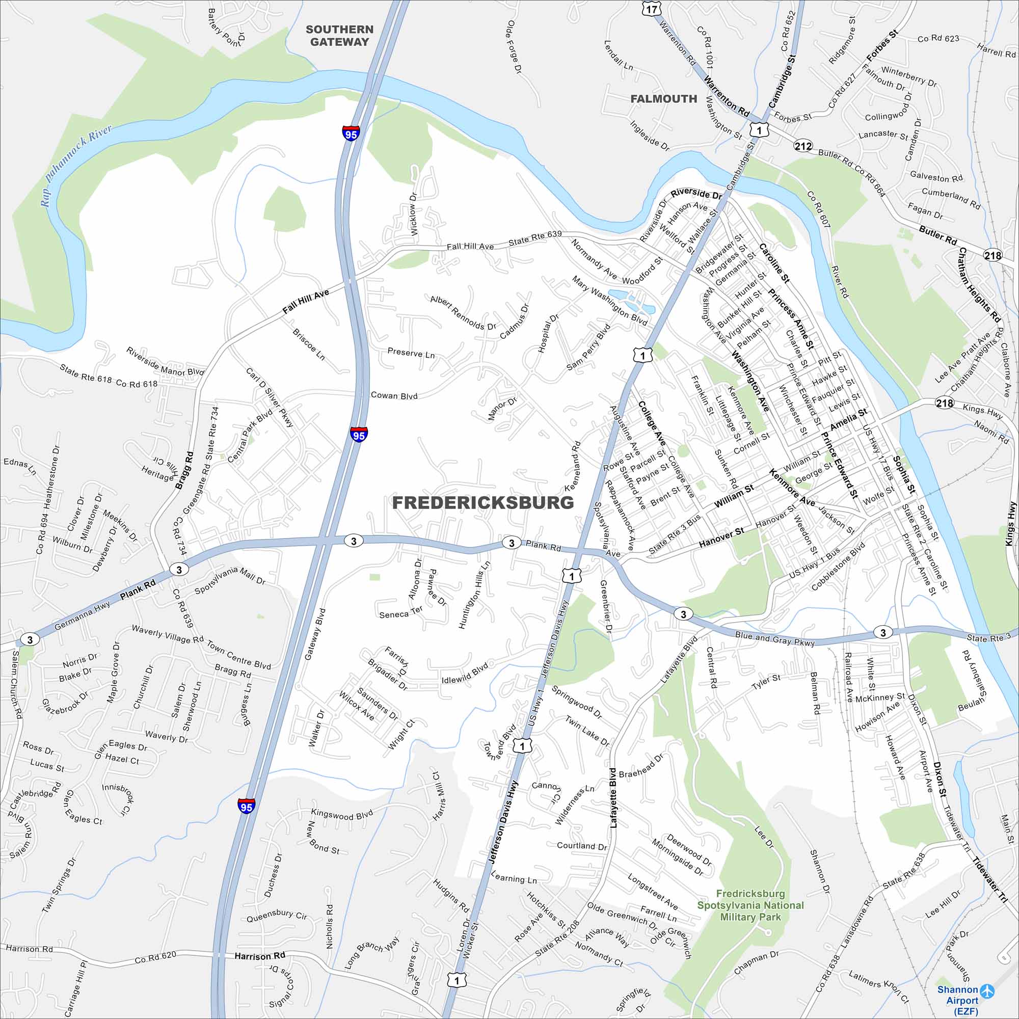 Explore our map of Fredericksburg along the Rappahannock River. The historic downtown sits near its banks. I-95 passes close, tying the city between D.C. and Richmond.
