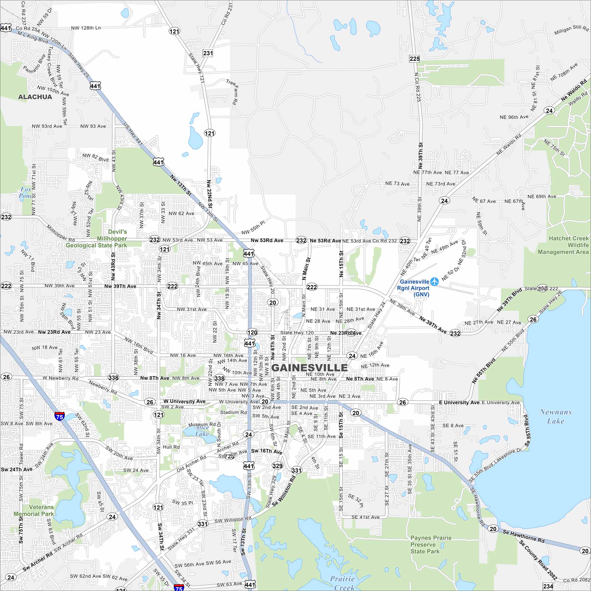 Gainesville is in north-central Florida, home to the University of Florida. This map shows lakes, creeks, and state parks. Highways link it across flat, green land.