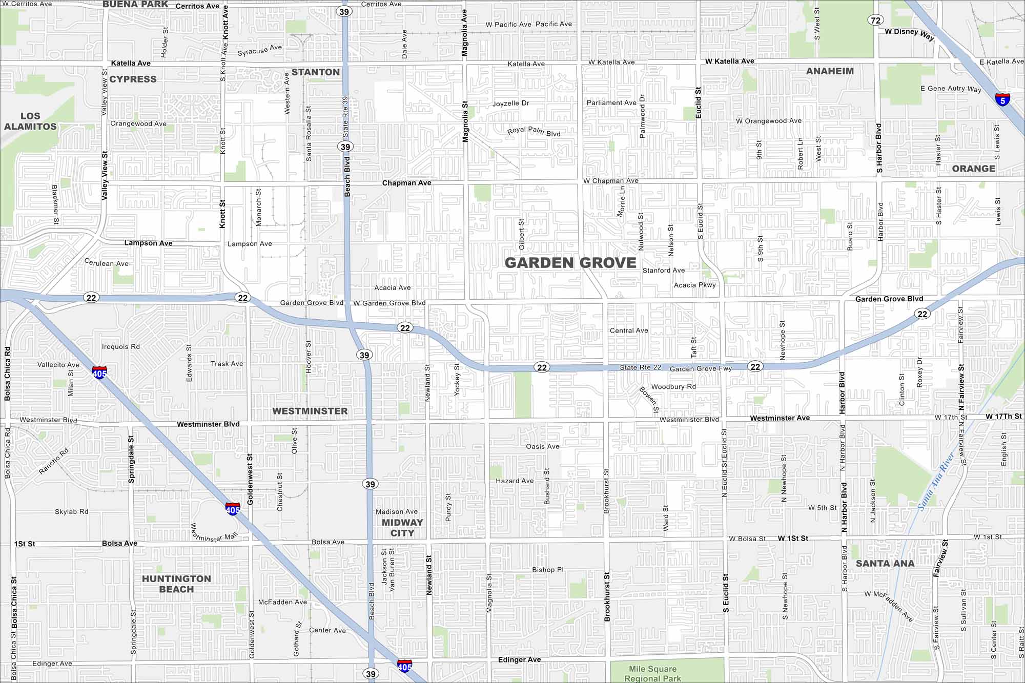 Garden Grove is in northern Orange County, just south of Anaheim. Our map shows dense neighborhoods mixed with major roads like Garden Grove Freeway.