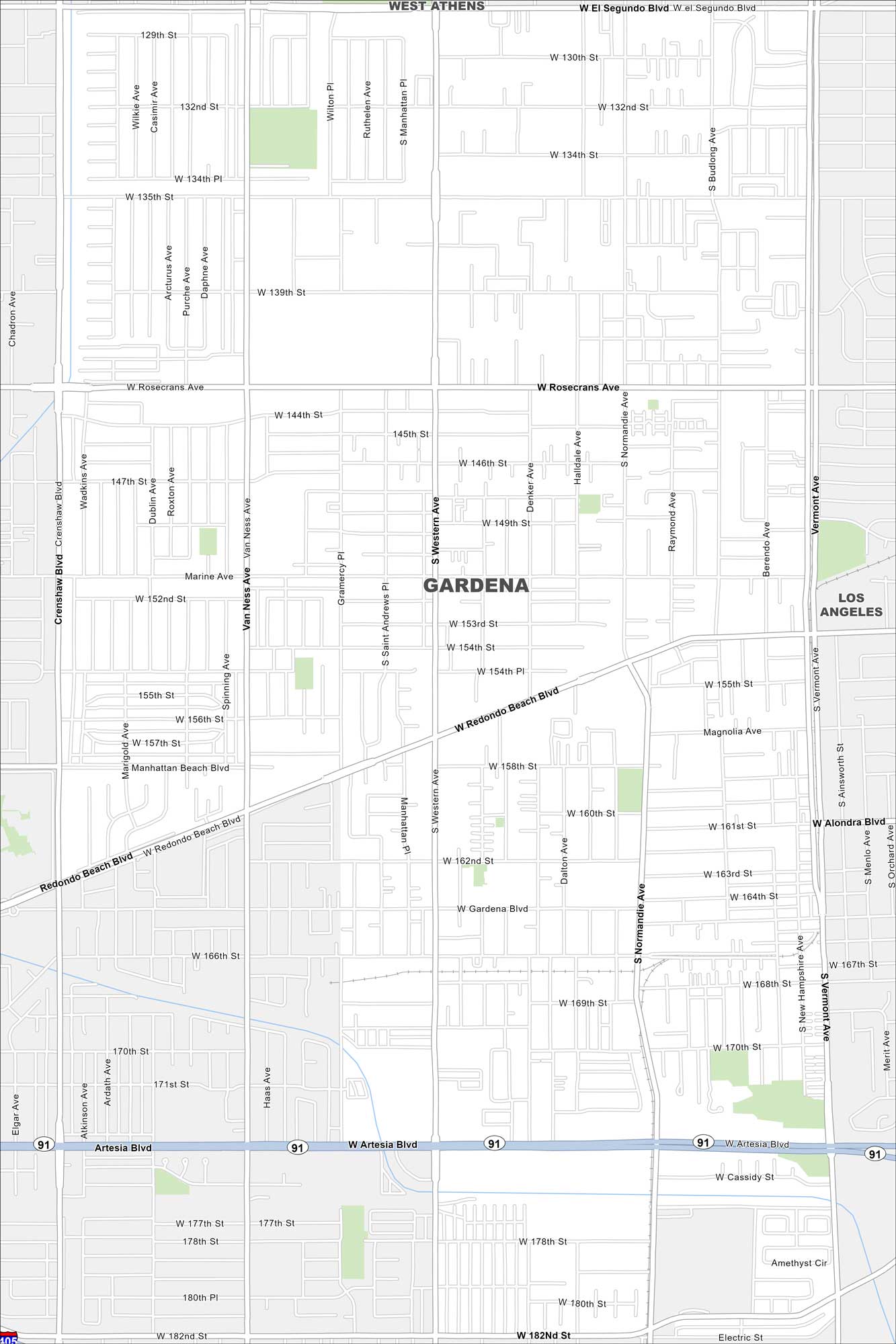 Follow the streets, highways, and streams with our map of Gardena, California. The city lies just south of downtown Los Angeles.