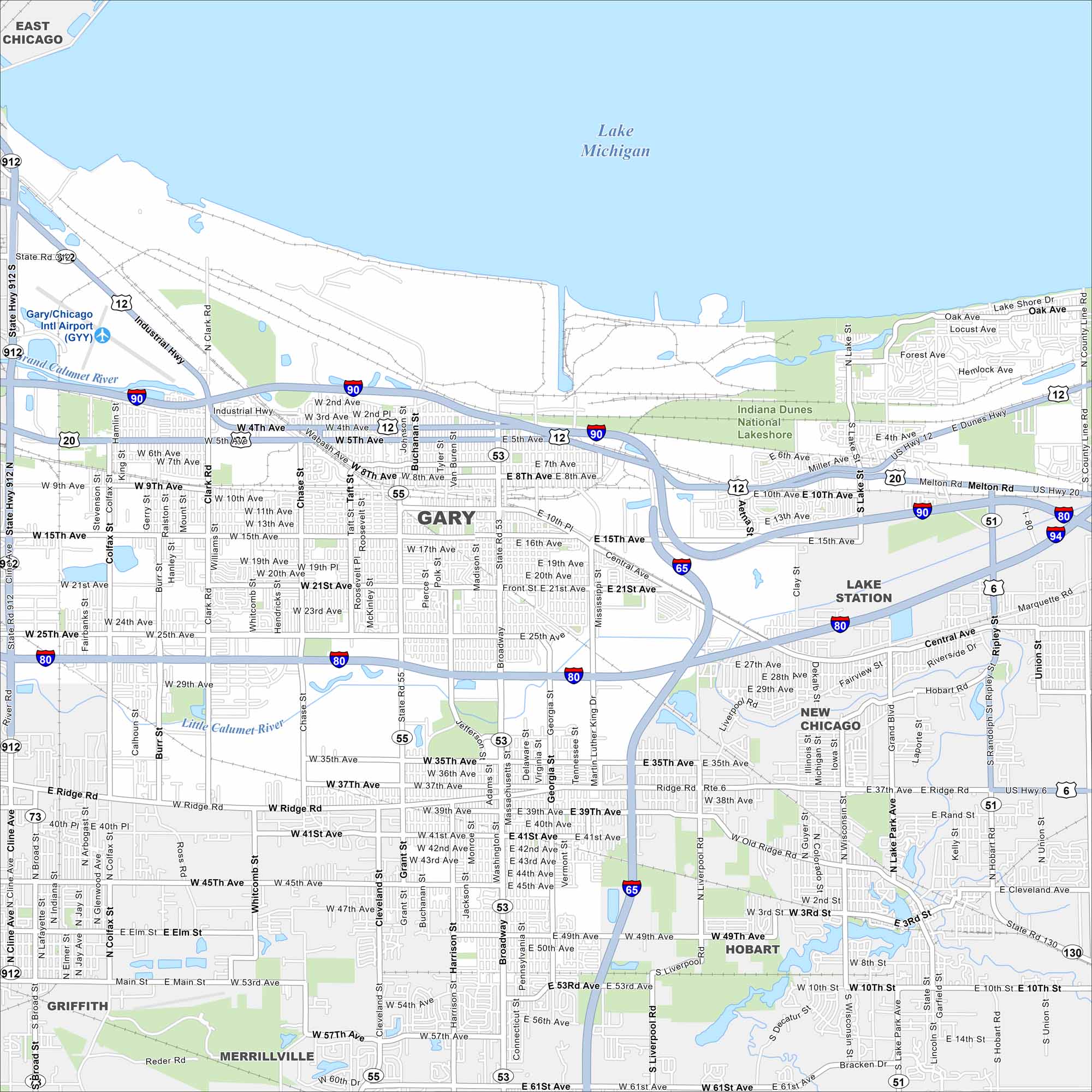 Get to know the major highways, city streets, and green areas. Our map of Gary shows its layout next to Lake Michigan. Gary is also known because of its steel industry past.