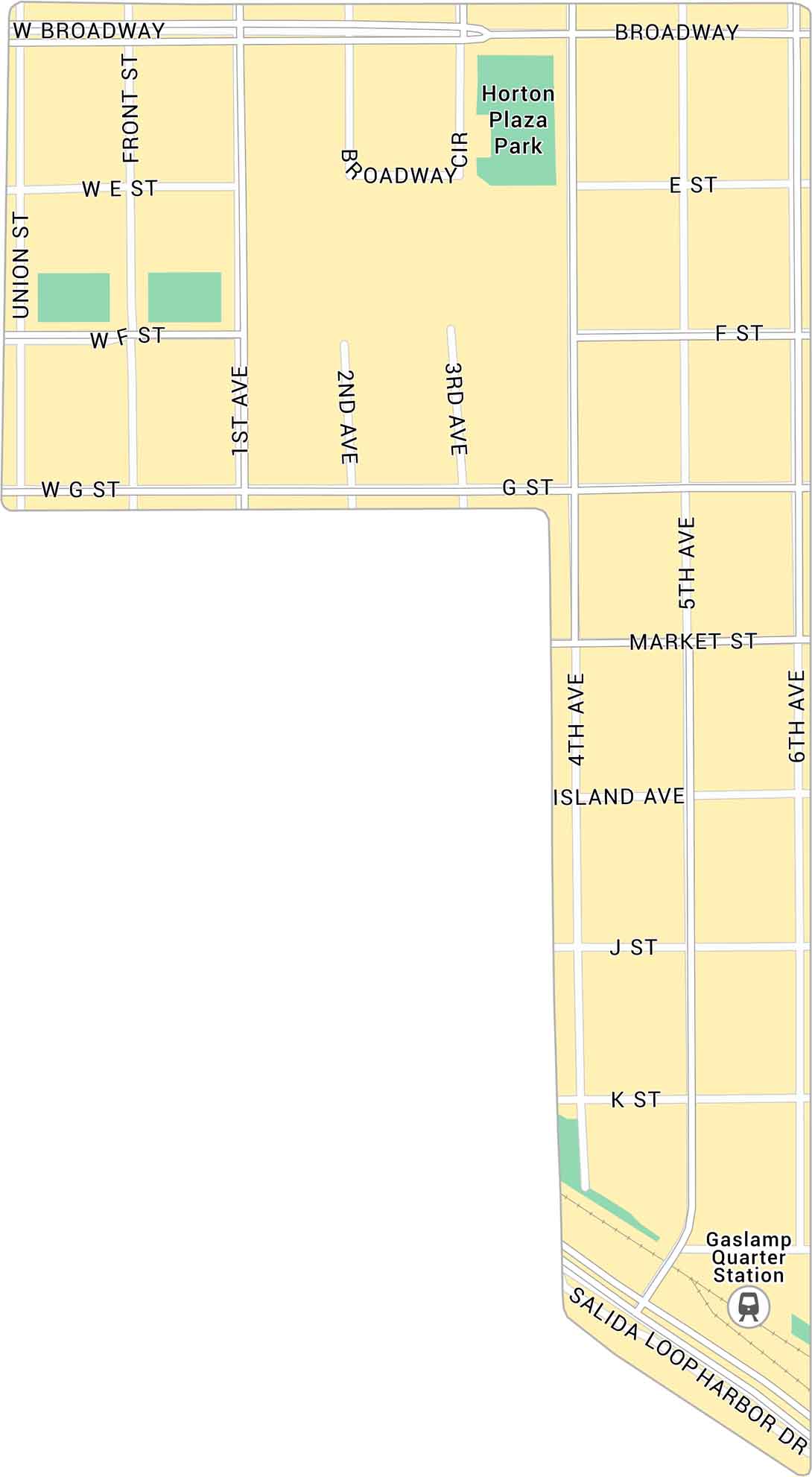 Our map of the Gaslamp Quarter shows the downtown San Diego district just north of the harbor. It’s a busy stretch packed with lights, noise, and gas lamp energy.
