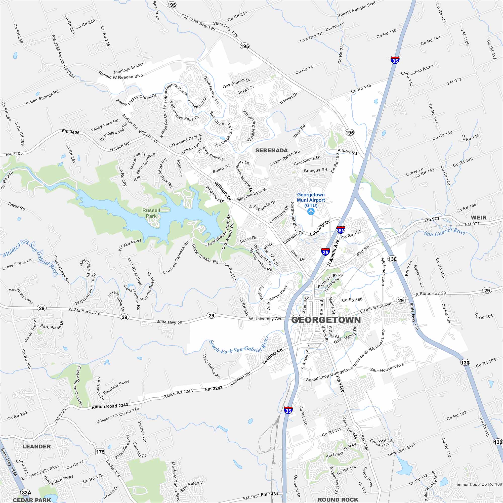 See the streets, highways, and rivers that cut through Georgetown, Texas. Our map displays its layout with plenty of green spaces. Georgetown is known for its historic square and location north of Austin.