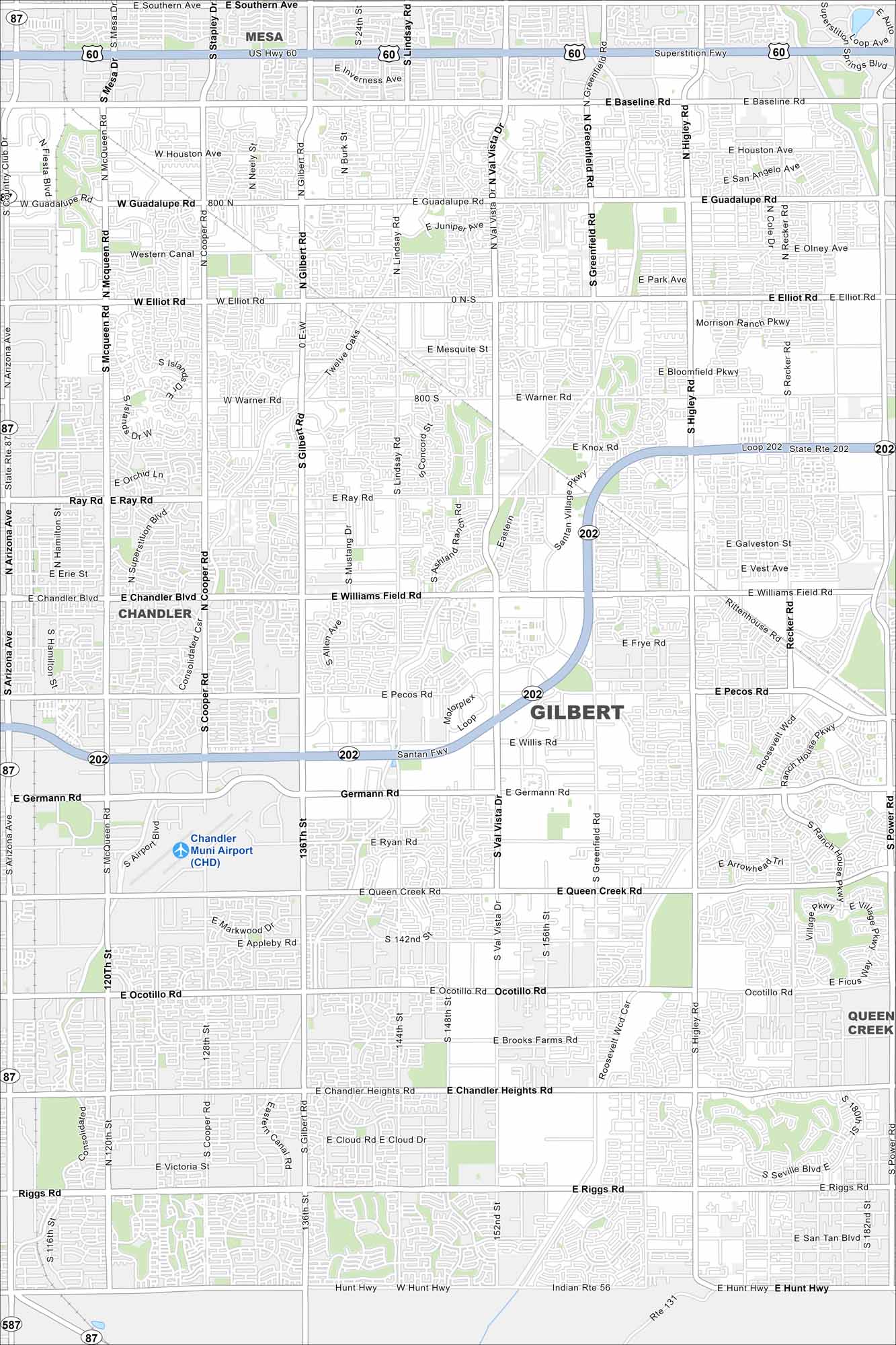 Our map of Gilbert, Arizona, shows a fast-growing suburb southeast of Phoenix. It was once recognized as the “Hay Shipping Capital of the World” back in the early 1900s.