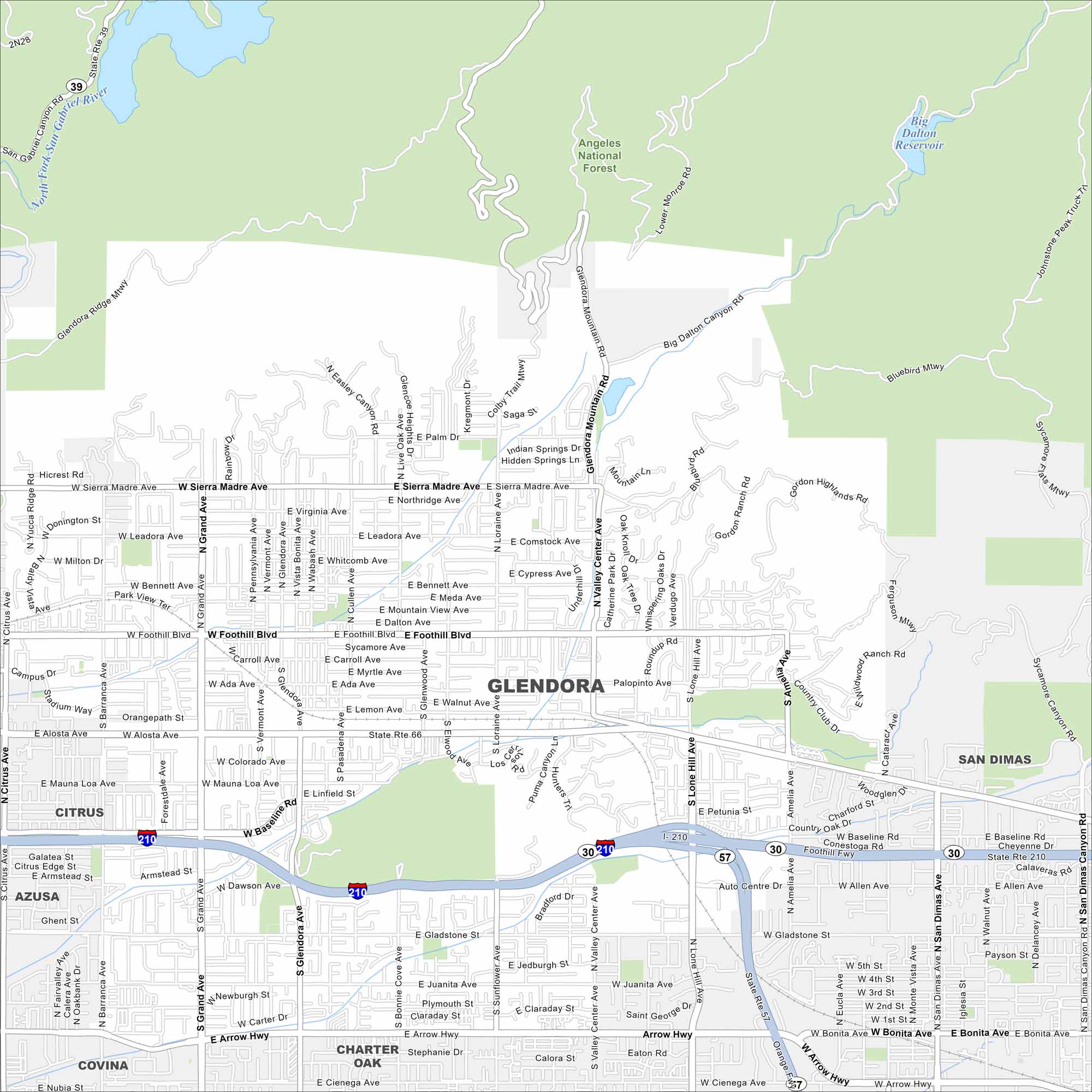Check out our map of Glendora, California. This city spreads all the way toward the San Gabriel Mountains. It’s often called the “Pride of the Foothills” because of its mountainous backdrop.