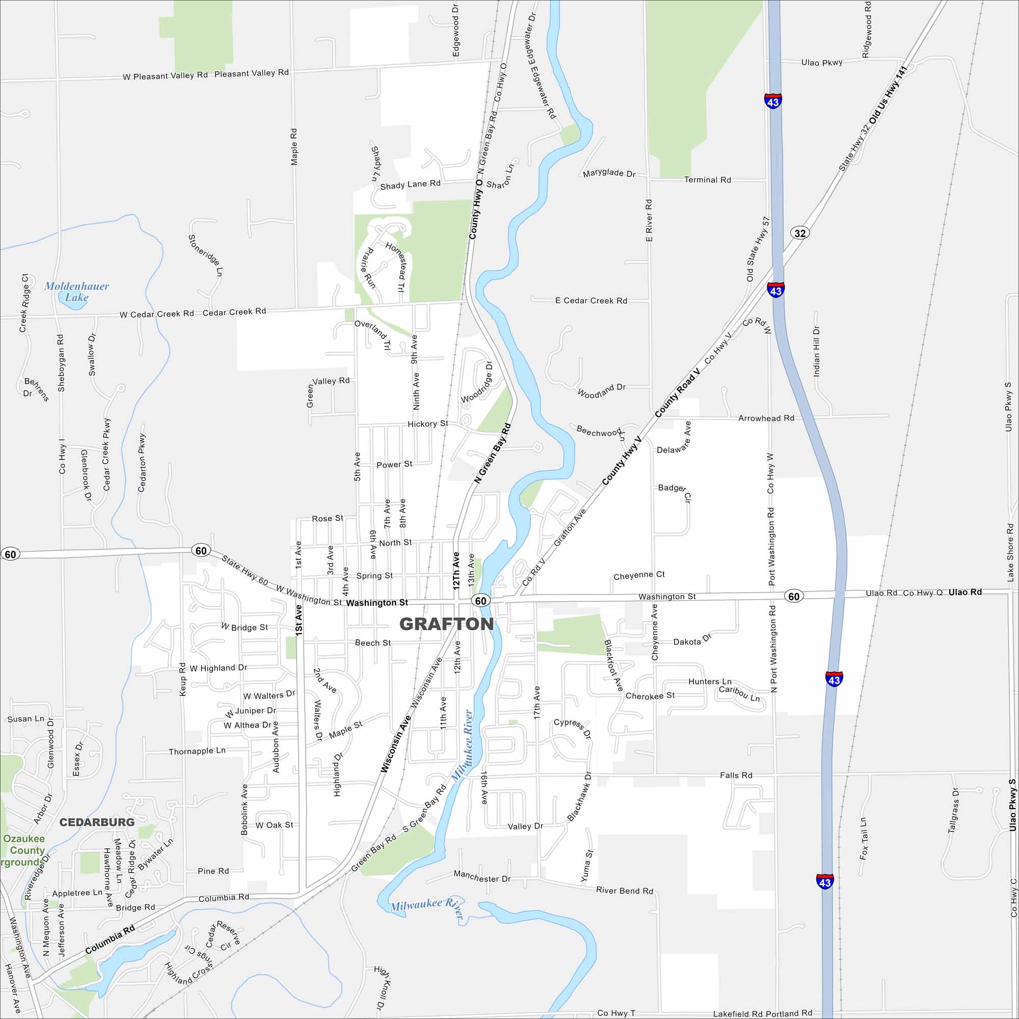 Our map of Grafton shows it north of Milwaukee along the Milwaukee River. The river winds through, shaping its layout. Just east, Lake Michigan adds a wide open edge.