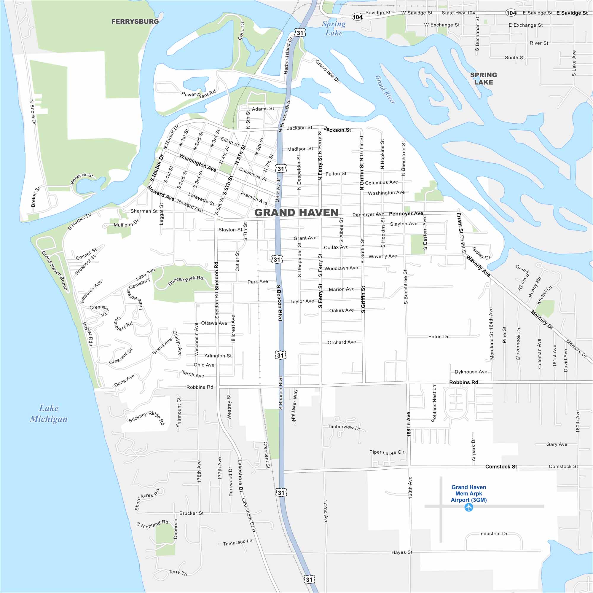 Check out our map of Grand Haven on Lake Michigan’s eastern shore. You’ll see the Grand River flowing into the lake, along with marina areas. It’s a popular spot for beaches and a well-known lighthouse.