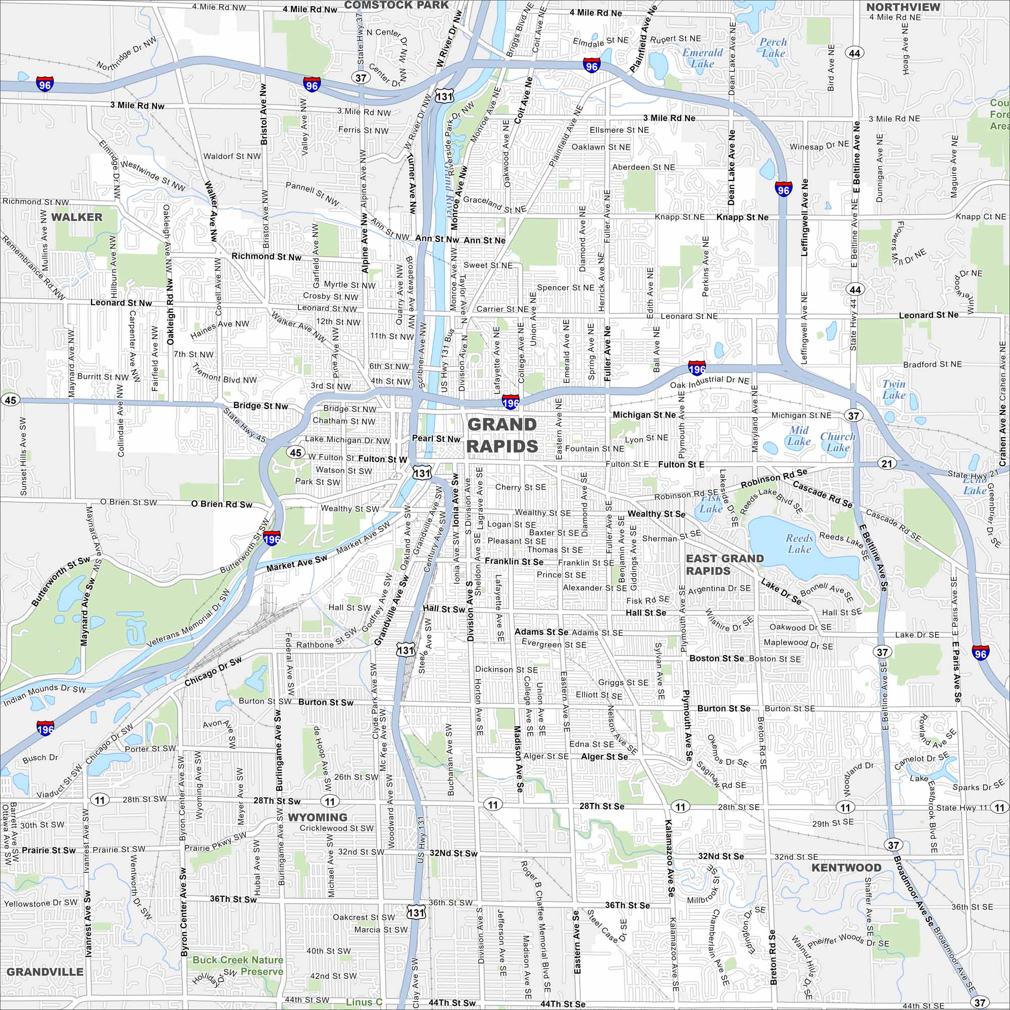 Our map of Grand Rapids follows the Grand River winding through downtown. Highways, parks, and neighborhoods stretch on both sides. The city is known as “Beer City USA” because of its craft breweries.