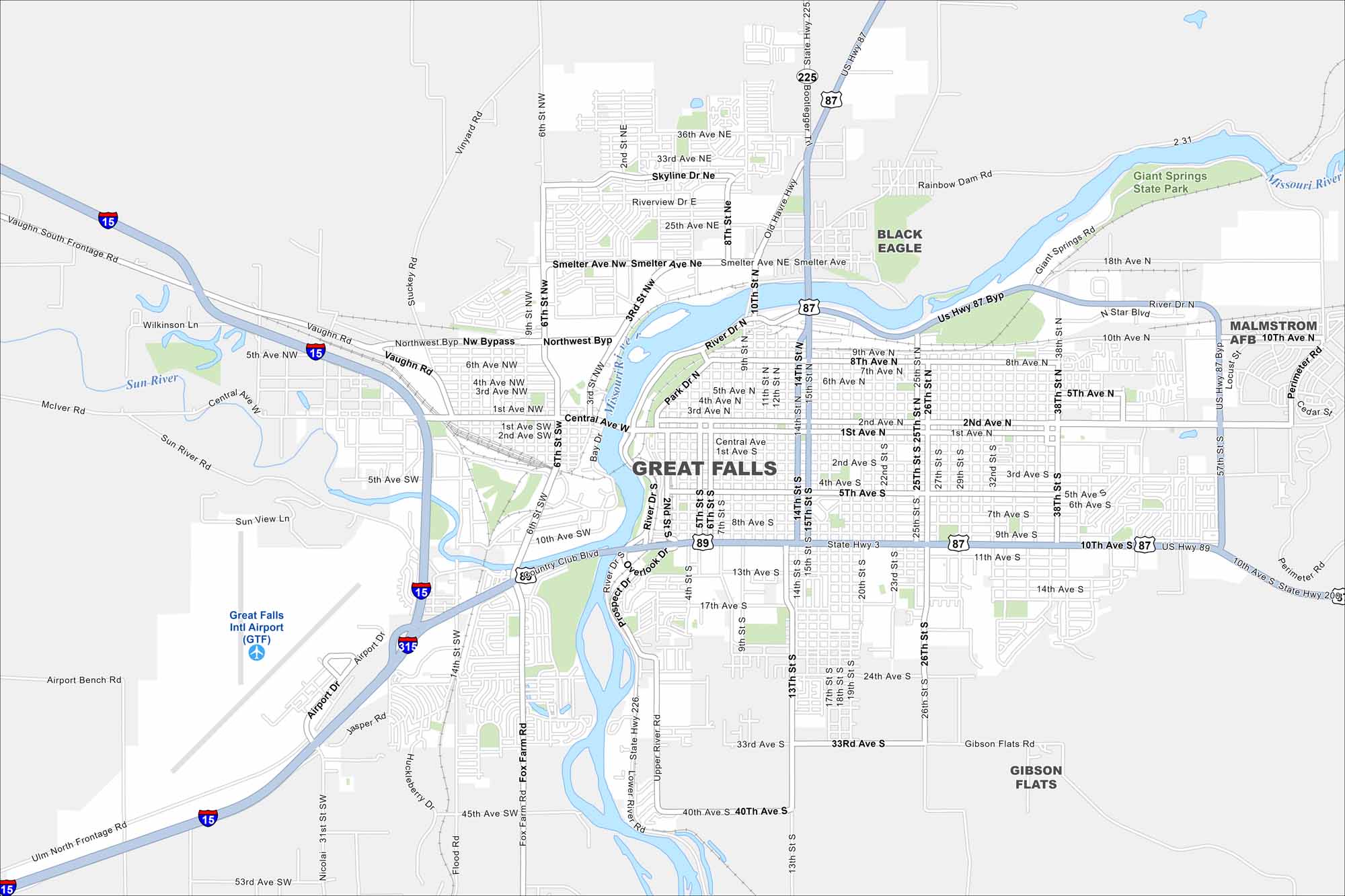 Explore our map of Great Falls, a city in central Montana. Located along the Missouri River, you’ll see rivers, roads and green spaces. The city is often called the “Electric City” because of the many hydroelectric dams nearby.