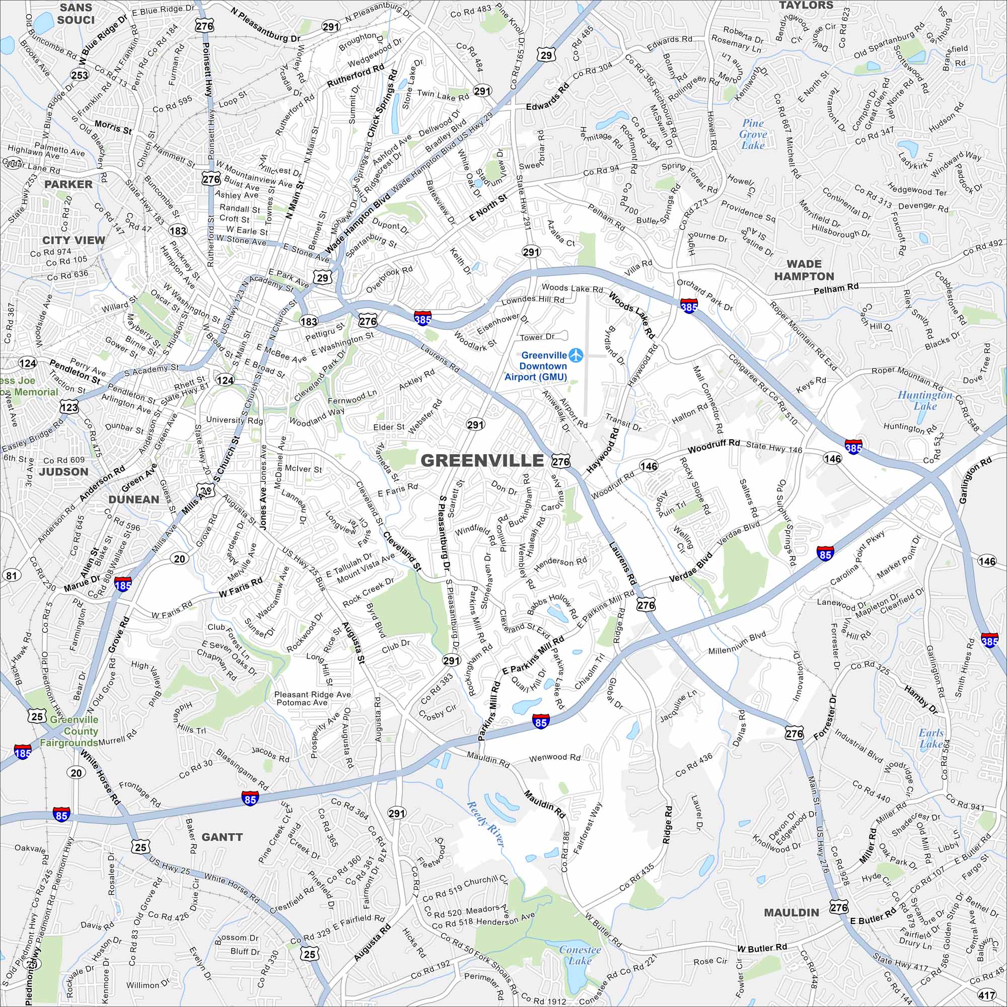 Check out our map of Greenville in the foothills of the Blue Ridge Mountains. The Reedy River cuts through downtown. Highways link it to Atlanta and Charlotte.