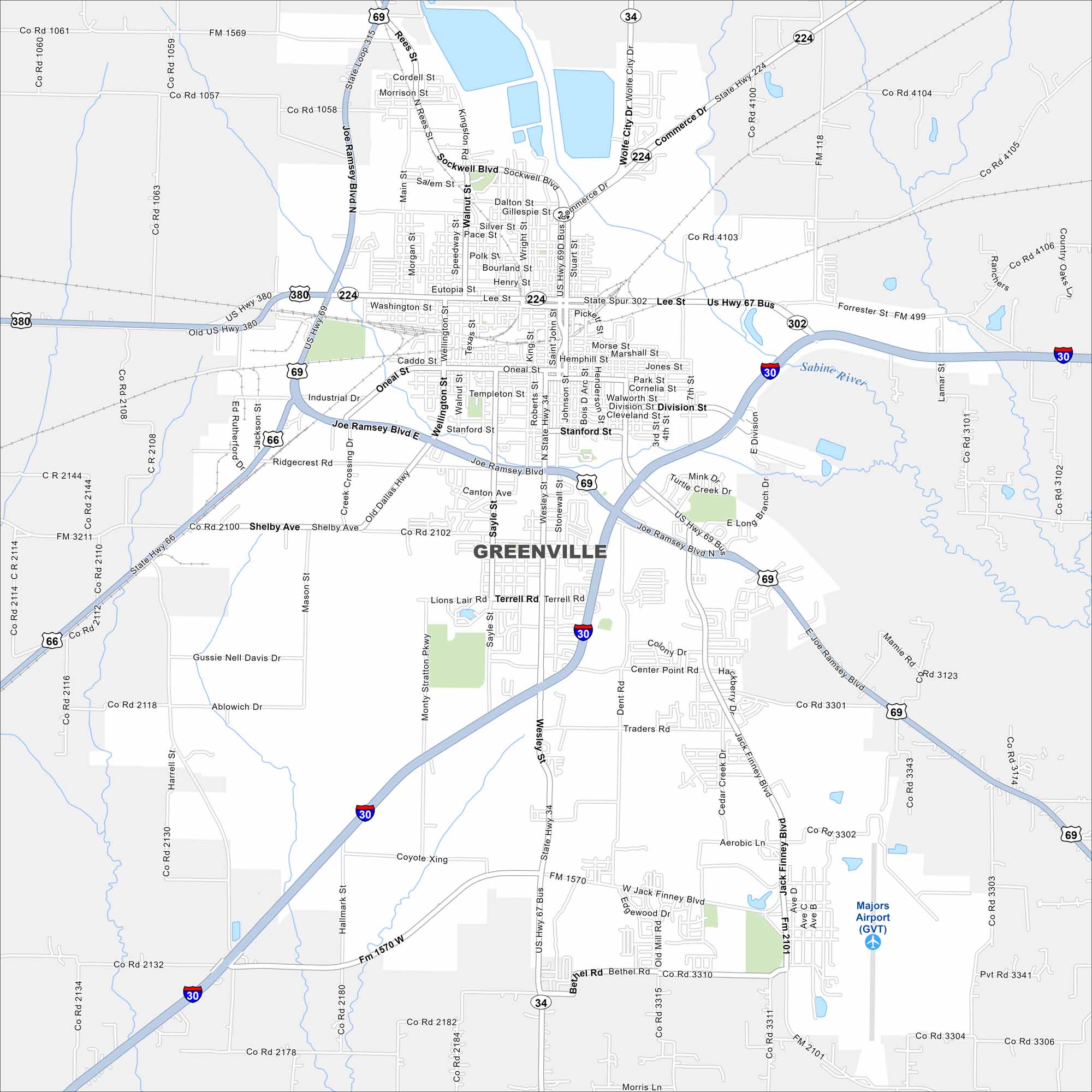 Our map of Greenville shows this city northeast of Dallas. The layout centers around U.S. Highway 69 and Interstate 30. But from here, farmland stretches outward in every direction.