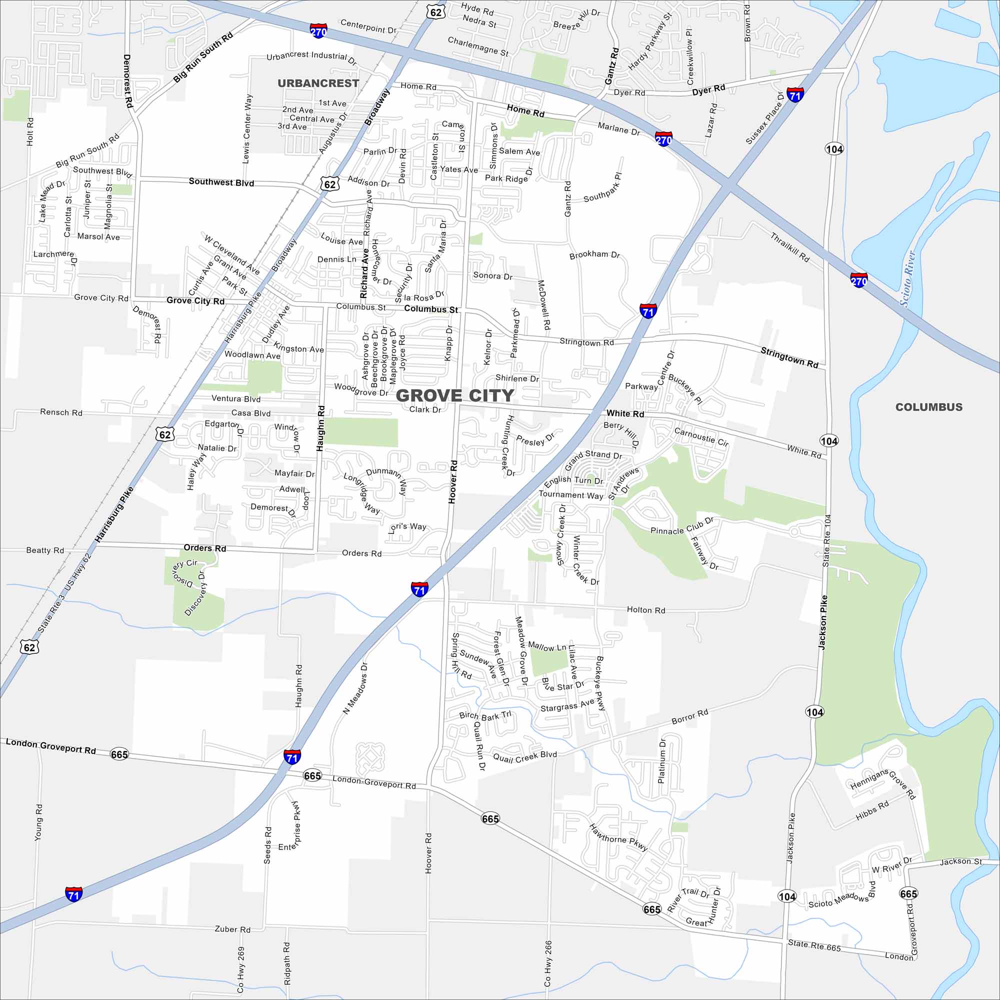 Grove City is in central Ohio, just south of Columbus. Interstates 71 and 270 connect it into the region. Our map shows highways, rivers, parks and open land.
